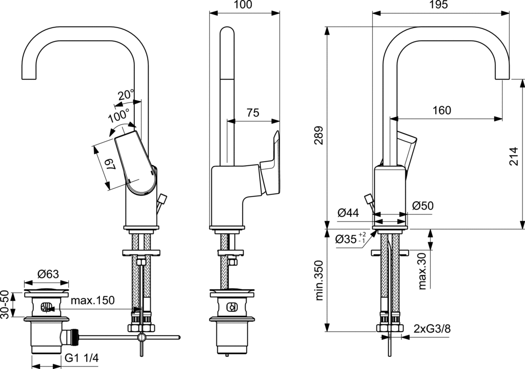 Bateria umywalkowa 100x207x289 mm, wylewka 160 mm 5 l/min (3 bary), z korkiem spustowym - TESI