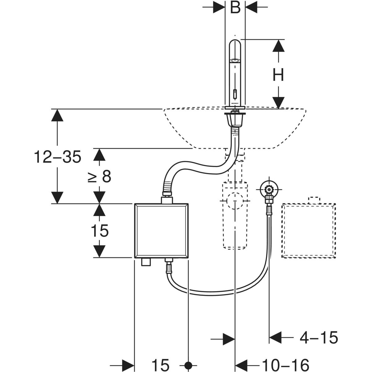 Poziom hałasu armatury Grupa I, zgodnie z DIN 4109 Automatyczne uruchamianie spłukiwania Wykrywanie za pomocą podczerwieni Czujnik podczerwieni z funkcją samoregulacji Wandalooporny Ograniczanie strumienia za pomocą regulatora strumienia Regulacja temperatury poprzez mieszacz (tylko w przypadku modelu z mieszaczem lub mieszaczem termostatycznym) Brak możliwości regulacji samej ciepłej lub samej zimnej wody (tylko w przypadku modelu z mieszaczem lub mieszaczem termostatycznym) Termostat wg EN 1111 (tylko w przypadku modeli z mieszaczem termostatycznym) Ochrona przed poparzeniem dzięki ograniczeniu temperatury wody do 42°C (tylko w przypadku modeli z mieszaczem termostatycznym) Możliwość termicznej dezynfekcji wg DVGW W 551 Zasilanie bateryjne Bateria wystarczająca na ok. 200'000 uruchomień Ostrzeżenie o słabej baterii Możliwość regulacji trybu oszczędzania energii Oszczędność wody dzięki precyzyjnej dwupromieniowej technice wykrywania użytkownika Możliwość zmiany ustawień oraz odczytu statystyk za pomocą pilota serwisowego Geberit Service-Handy Ustawienia i obsługa urządzenia za pomocą urządzenia mobilnego przez zintegrowany interfejs Bluetooth® Kompatybilny z aplikacją Geberit Control Możliwość regulacji programu z funkcją oszczędzającą wodę Możliwość regulacji programu spłukiwania okresowego Możliwość indywidualnej regulacji czasu trwania spłukiwania Możliwość wyłączenia uruchamiania spłukiwania Ze zintegrowanym zaworem zwrotnym Jednostka funkcjonalna z wbudowanym filtrem koszyczkowym Do zastosowania w obiektach publicznych i pół-publicznych Do montażu w umywalce lub blacie pod umywalkę Do podłączania zimnej i ciepłej wody (tylko w przypadku modelu z mieszaczem lub mieszaczem termostatycznym) Do podłączania zimnej lub zmieszanej wody (tylko w modelach bez mieszacza) Do zastosowania również z umywalkami ze stali nierdzewnej Model bez mieszacza nadaje się do połączenia z podgrzewaczem, patrz arkusz danych technicznych „Baterie umywalkowe z podgrzewaczami”