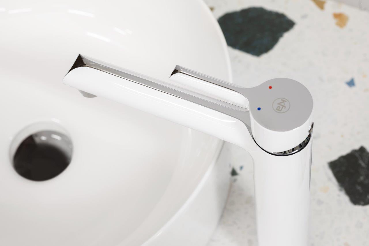 Bateria umywalkowa stojąca nablatowa KFA Armatura ANGELIT click clack, chrom, biały, montaż blat / otwór na baterię