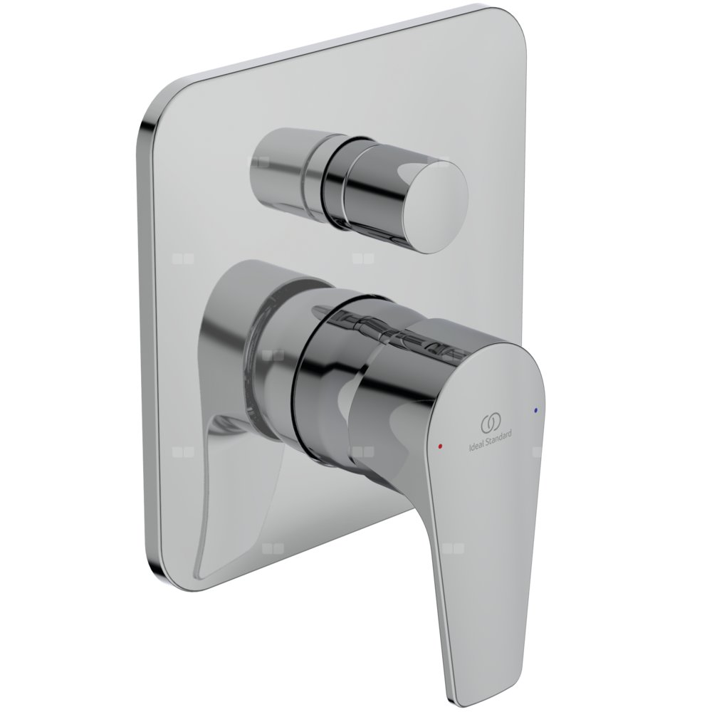 Zestaw montażowy (widoczna część). Głowica 47 mm CLICK. Metalowy uchwyt z nadrukowanymi czerwonymi i niebieskimi oznaczeniami. Chromowana rozeta z tworzywa. Automatyczny przełącznik. Zgodność z EN817. Do skompletowania z uniwersalnym zestawem podtynkowym A1000NU.
