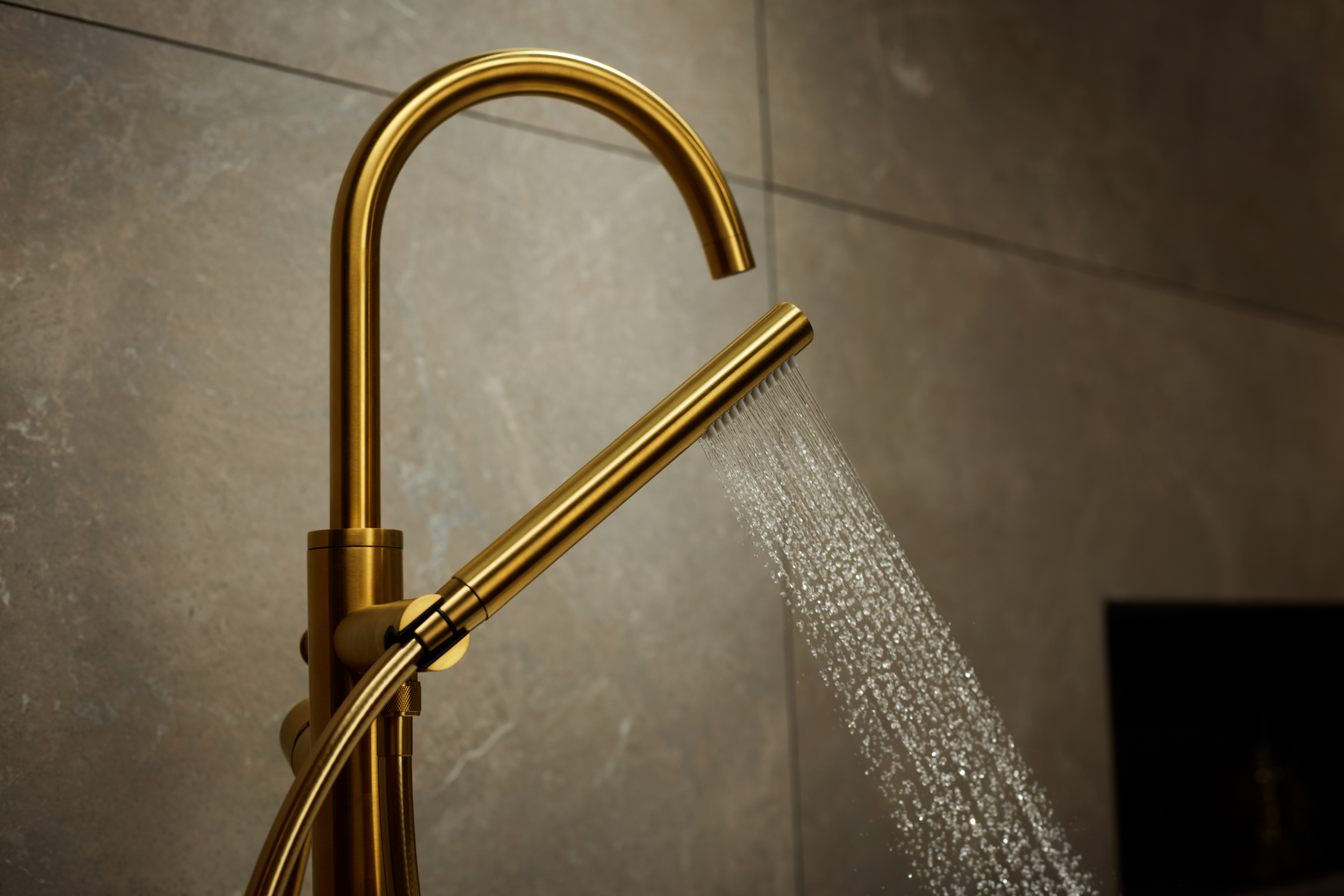Bateria wannowa stojąca KFA Armatura MOZA, kolor złoty, montaż podłoga