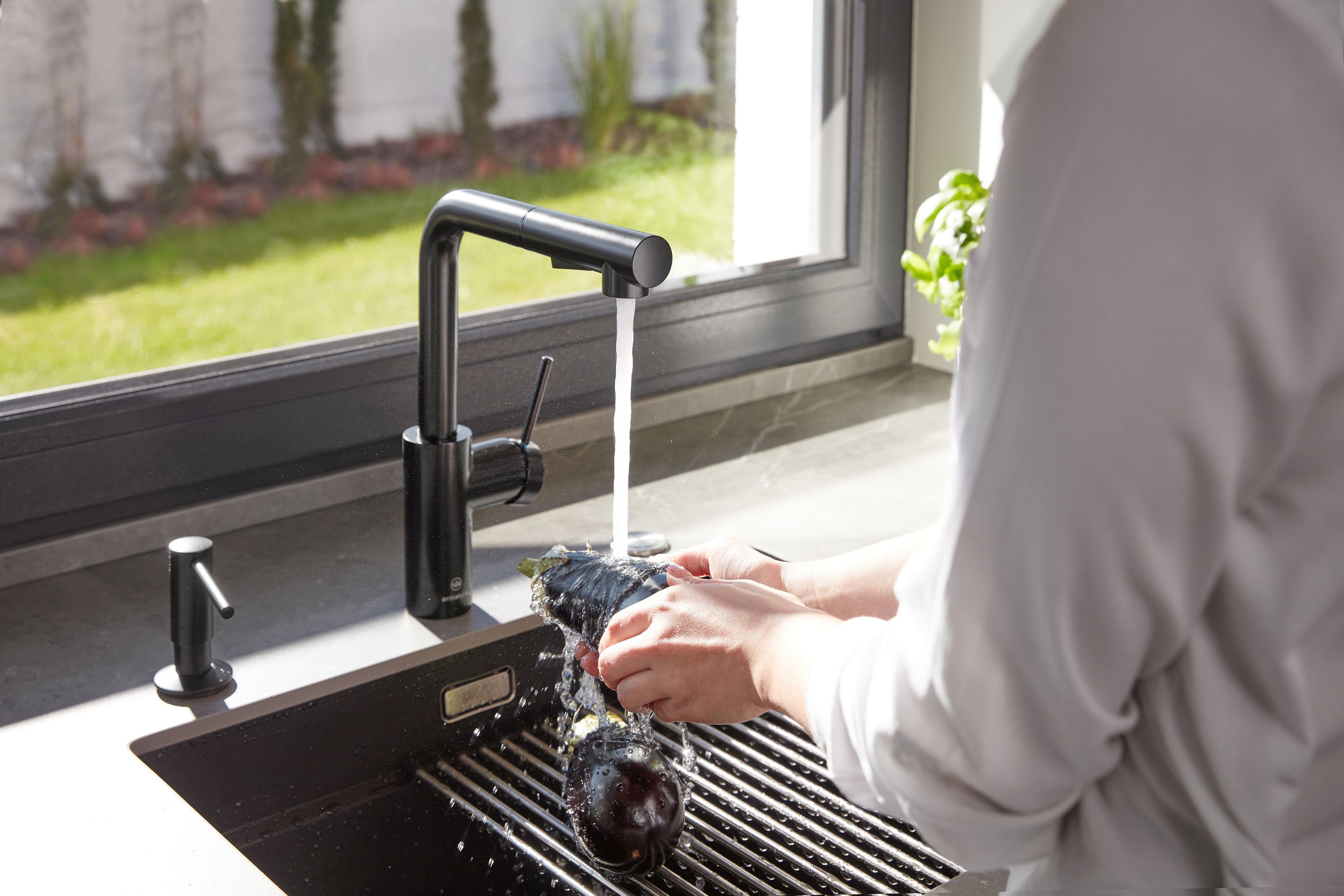 Bateria zlewozmywakowa stojąca KFA Armatura DUERO BASIC, kolor czarny, wyciągana wylewka i obrotowa wylewka 2 funkcyjna, obrotowy górny, wys. 301 mm