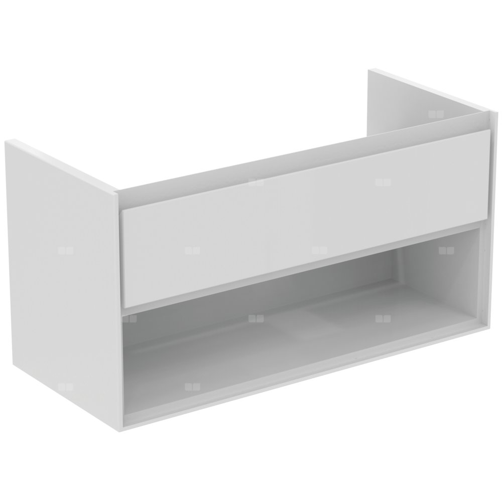 Wisząca 100 cm. 1 szuflada ze zintegrowanym uchwytem. Szuflady z systemem samodomykania. Otwarta dolna półka. Zestaw montażowy w komplecie. Szafka do skompletowania z: umywalką z powierzchniami bocznymi 104 cm E027401 lub. umywalką nablatową 60 cm E034801/40 cm E034701 z wymaganym blatem E0851. Zalecany: syfon oszczędzający przestrzeń EE23033967 (zamawiany oddzielnie).
