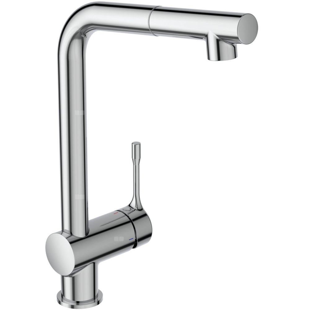 Bateria kuchenna stojąca BlueStart z wysoką wyciąganą wylewką. Wysoka ruchoma i wyciągana 1-funkcyjna wylewka typu L. Metalowy uchwyt z nadrukowanymi czerwonymi i niebieskimi oznaczeniami. Technologia Cold Start - przepływ wody zimnej wody. Ukryty aerator. Głowica FirmaFlow 38 mm, z ogranicznikiem temperatury. Technologia Click. Wężyki przyłączeniowe G3/8”. System montażu Easy-Fix. Zgodność z normą EN817.