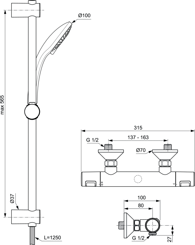 Bateria termostatyczna natryskowa naścienna Ceratherm T25. Standardowe przyłącza mimośrodowe. Głowica termostatyczna IS nowej technologii. Ceramiczny zawór G1/2 180°. Bez akcesoriów w komplecie. Uchwyt z ogranicznikiem temperatury do 40°C i przyciskiem redukującym wypływ o 50%. Zawór zwrotny. W komplecie zestaw natryskowy: słuchawka natryskowa 100 mm 3-funkcyjna Idealrain, z ogranicznikiem przepływu 8l/min oraz wąż natryskowy 1250 mm Idealflex i drążek natryskowy 600 mm z regulacją punktów mocowania do ściany. Zalecane dodatkowe elementy: nakładana półka do baterii termostatycznych Ceratherm T25, T50 i T100 A7215AA.