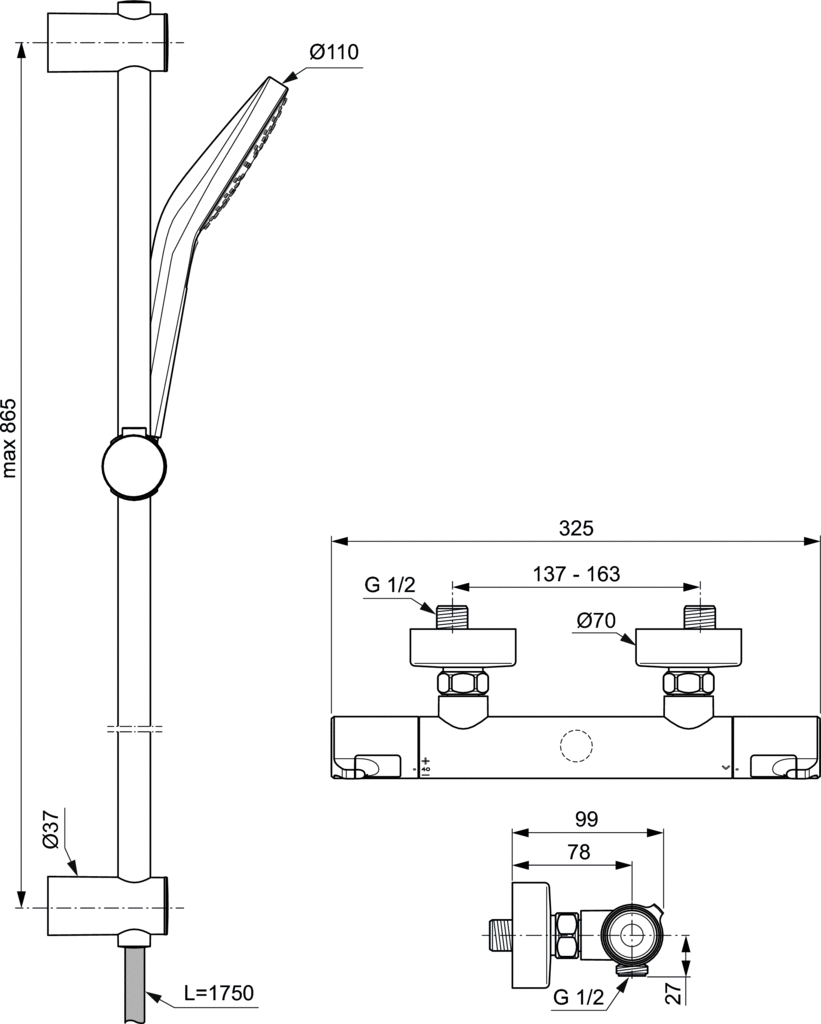 System natryskowy Ceratherm T50 natynkowy z akcesoriami. Standardowe przyłącza mimośrodowe. Głowica termostatyczna IS nowej technologii. Ceramiczny zawór G1/2 180°. Uchwyt z ogranicznikiem temperatury do 40°C i przyciskiem redukującym przepływ wody o 50%. Zawór zwrotny. W komplecie system natryskowy: słuchawka natryskowa 110 mm 3-funkcyjna Idealrain Evo Round, z ogranicznikiem przepływu 8l/min oraz wąż natryskowy 1750 mm Idealflex i drążek natryskowy 600 mm z regulacją punktów mocowania do ściany. Zalecane dodatkowe elementy: nakładana półka do baterii termostatycznych Ceratherm T25, T50 i T100 A7215AA.