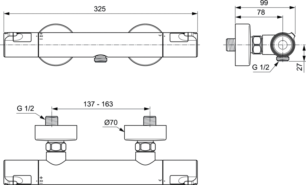 Bateria termostatyczna natryskowa naścienna Ceratherm T25. Standardowe przyłącza mimośrodowe. Głowica termostatyczna IS nowej technologii. Ceramiczny zawór G1/2 180°. Brak akcesoriów w komplecie. Uchwyt z ogranicznikiem temperatury do 40°C i przyciskiem redukującym przepływ wody o 50%. Zawór zwrotny. Zalecane dodatkowe elementy: Nakładana półka do baterii termostatycznych Ceratherm T25, T50 i T100 A7215AA.