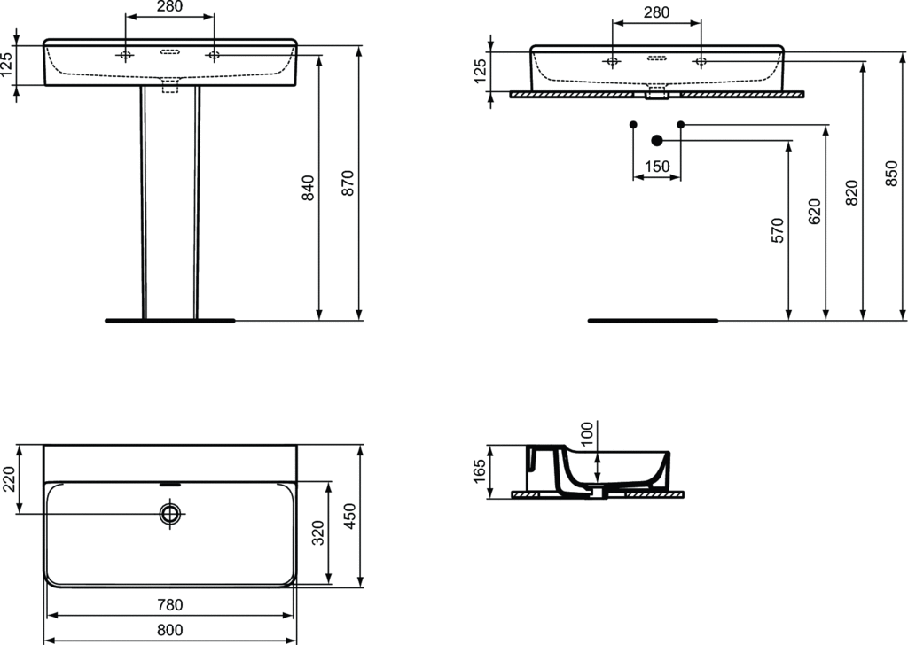 Umywalka Conca mocowana do ściany z przelwem (kształt szczelinowy), bez otworu na baterię.