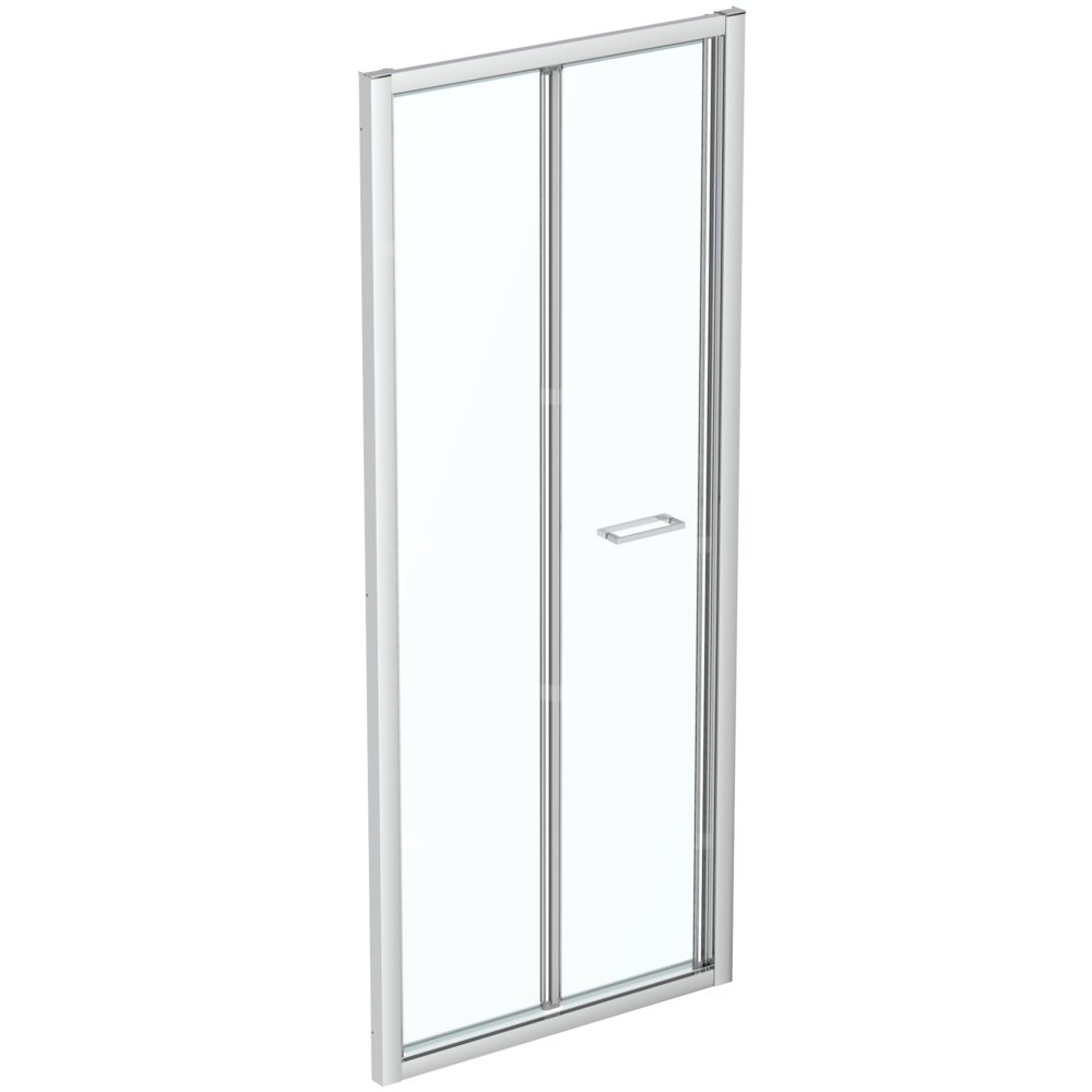 CONNECT 2 Drzwi prysznicowe składane. Wysokość 195 cm. Bezpieczne, hartowane, szkło grubości 6 mm. Szkło przeźroczyste pokryte w standardzie powłoką IDEAL CLEAN ułatwiającą utrzymanie czystości. Profile aluminiowe dostępne w kolorach srebrnym połysk i biały mat. Wygodne metalowe uchwyty drzwi długości 225 mm w kolorze chrom. Profile ułatwiające montaż i dostosowanie wymiarów kabiny w zakresie do 25 mm. Drzwi składane na zewnątrz i do wewnątrz do montażu we wnęce lub do skompletowania z wybraną ścianką boczną jako kabina narożna. Możliwość montażu bezpośrednio na podłodze lub skompletowania z odpowiednimi brodzikami Ideal Standard. Zalecane dodatkowe elementy: CONNECT 2 Ścianka boczna w wybranym rozmiarze. Uwaga: Drzwi kabiny są odwracalne.