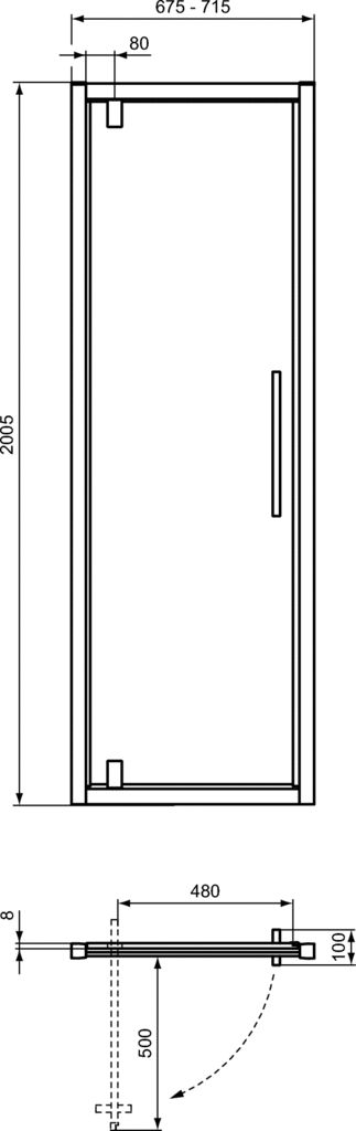 Drzwi obrotowe 675x2005 mm z wykończeniem w kolorze jasnego srebra, 1 drzwi, grubość szkła (8mm), regulacja w poziomie (20mm), idealClean - I.LIFE