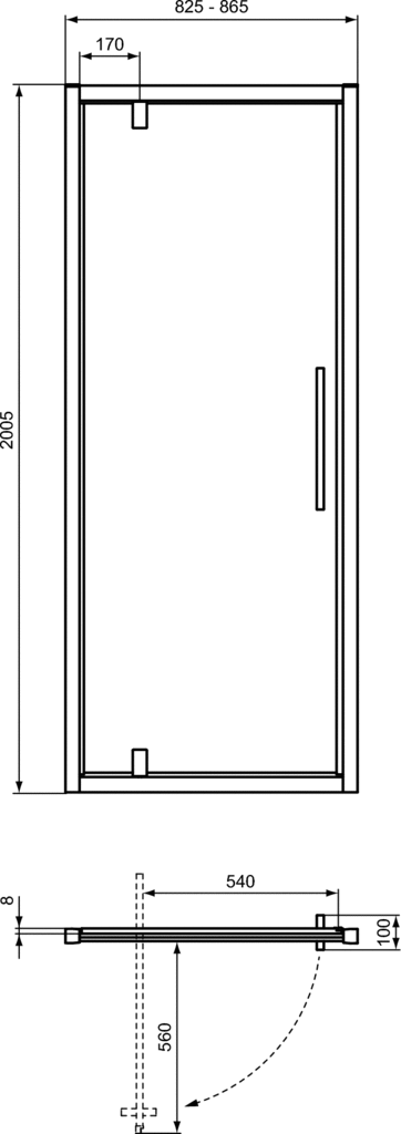 Drzwi obrotowe 825x100x2005 mm w wykończeniu w kolorze jasnego srebra, 1 drzwi, grubość szkła (8mm), regulacja w poziomie (20mm), idealClean - I.LIFE