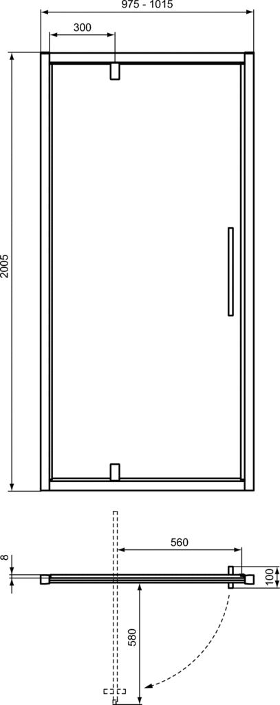 Drzwi obrotowe 975x100x2005 mm z wykończeniem w kolorze jasnego srebra, 1 drzwi, grubość szkła (8mm), regulacja w poziomie (20mm), idealClean - I.LIFE