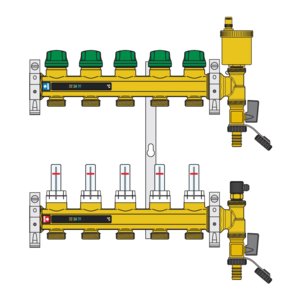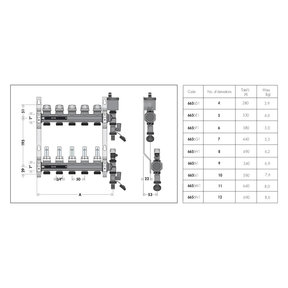 Zespół rozdzielaczy Zawiera: - rozdzielacz powrotny z wkładkami równoważącymi DYNAMICAL® przystosowanymi do współpracy z siłownikami elektrotermicznymi, zakres regulacji 25÷170 l/h; - rozdzielacz zasilania z przepływomierzami; - zakończenie rozdzielacza z automatycznym odpowietrznikiem z kapturkiem higroskopijnym i zaworem spustowym; - stalowe uchwyty montażowe do zastosowania w skrzynkach lub bezpośrednio na ścianie. główne podłączenie: G 1" (ISO 228-1) GW, Podłączenie do złączek Caleffi. przyłącza wylot: G 3/4" A (ISO 228-1) GZ, 7 wyjść. Maksymalne ciśnienie pracy: 6 bar. Zakres temperatury medium: 5–60 °C. Rozstaw wyjść: 50 mm. Zakres regulacji natężenia przepływu: 25–150 l/h.
