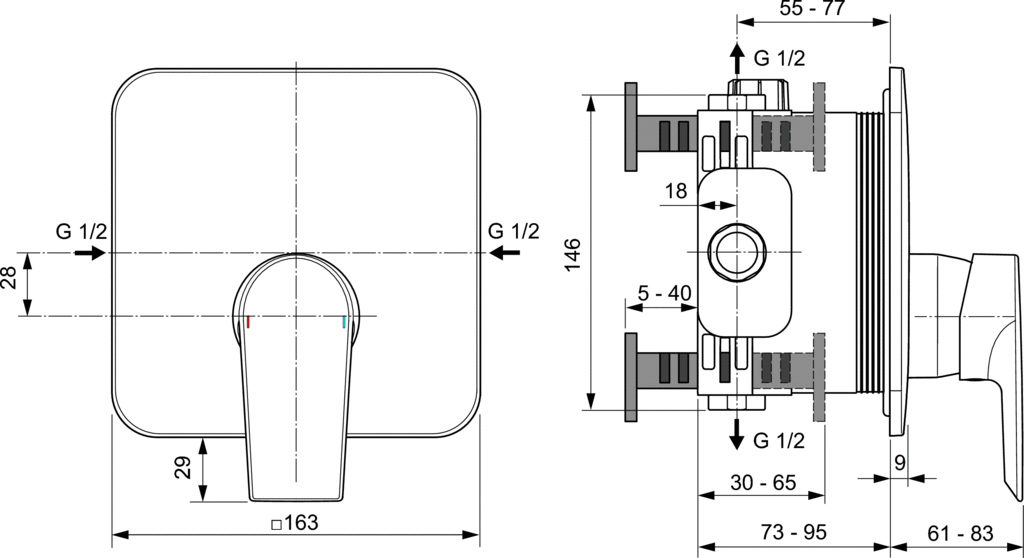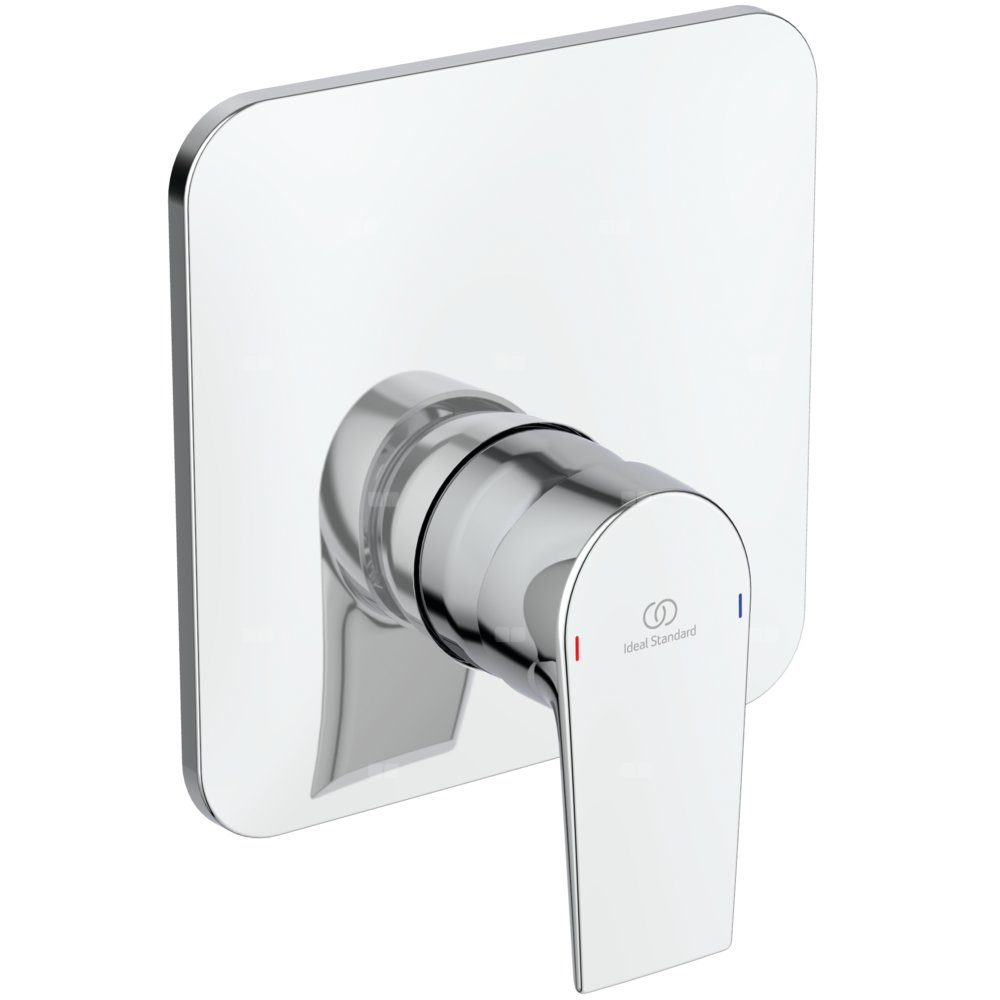Zestaw montażowy podtynkowej baterii natryskowej. Głowica IS 47 mm CLICK. Metalowy uchwyt z logo Ideal Standard oraz nadrukowanymi czerwonymi i niebieskimi oznaczeniami, chromowana metalowa rozeta. Klasa akustyczna 1. Zgodna z EN817.Do skompletowania z zestawem A1000NU (część wewnętrzna).