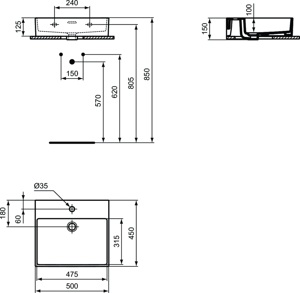 Umywalka Extra mocowana do ściany z 1 wybitym otworem na baterię oraz przelewem. Nieszlifowana od spodu (szkliwiona od spodu): nieodpowiednia do montażu na blacie (nie zapewnia dostatecznie płaskiej powierzchni). Dowiedz się więcej o zalecanym wyposażeniu w katalogu lub cenniku Atelier Collections.