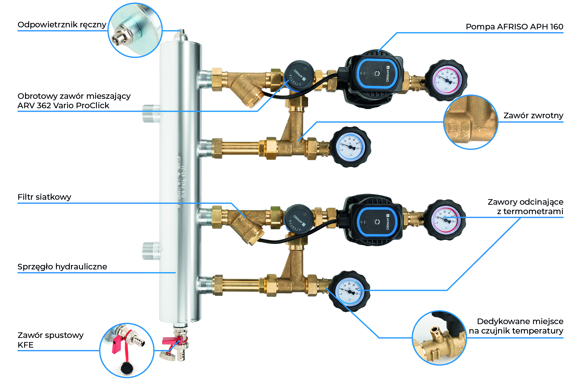 Pozwala na przyłączenie dwóch obiegów grzewczych/chłodzących.