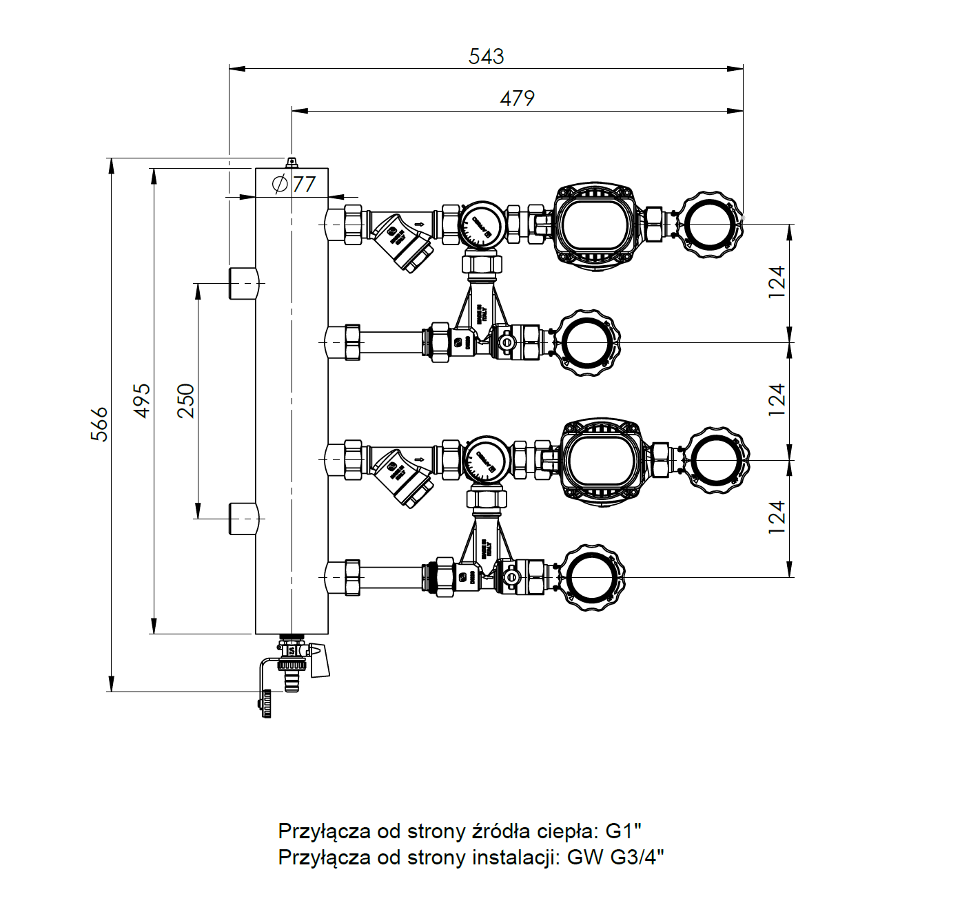 Zawory odcinające ze zintegrowanymi termometrami do kontroli temperatury medium na każdym przyłączu.