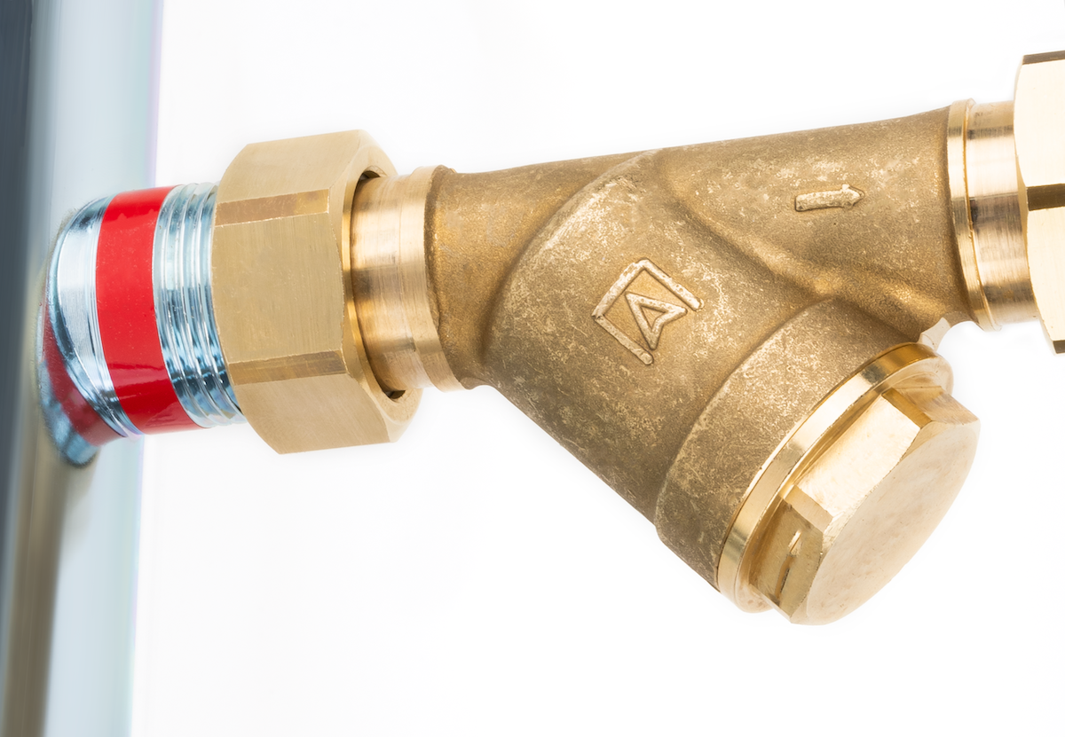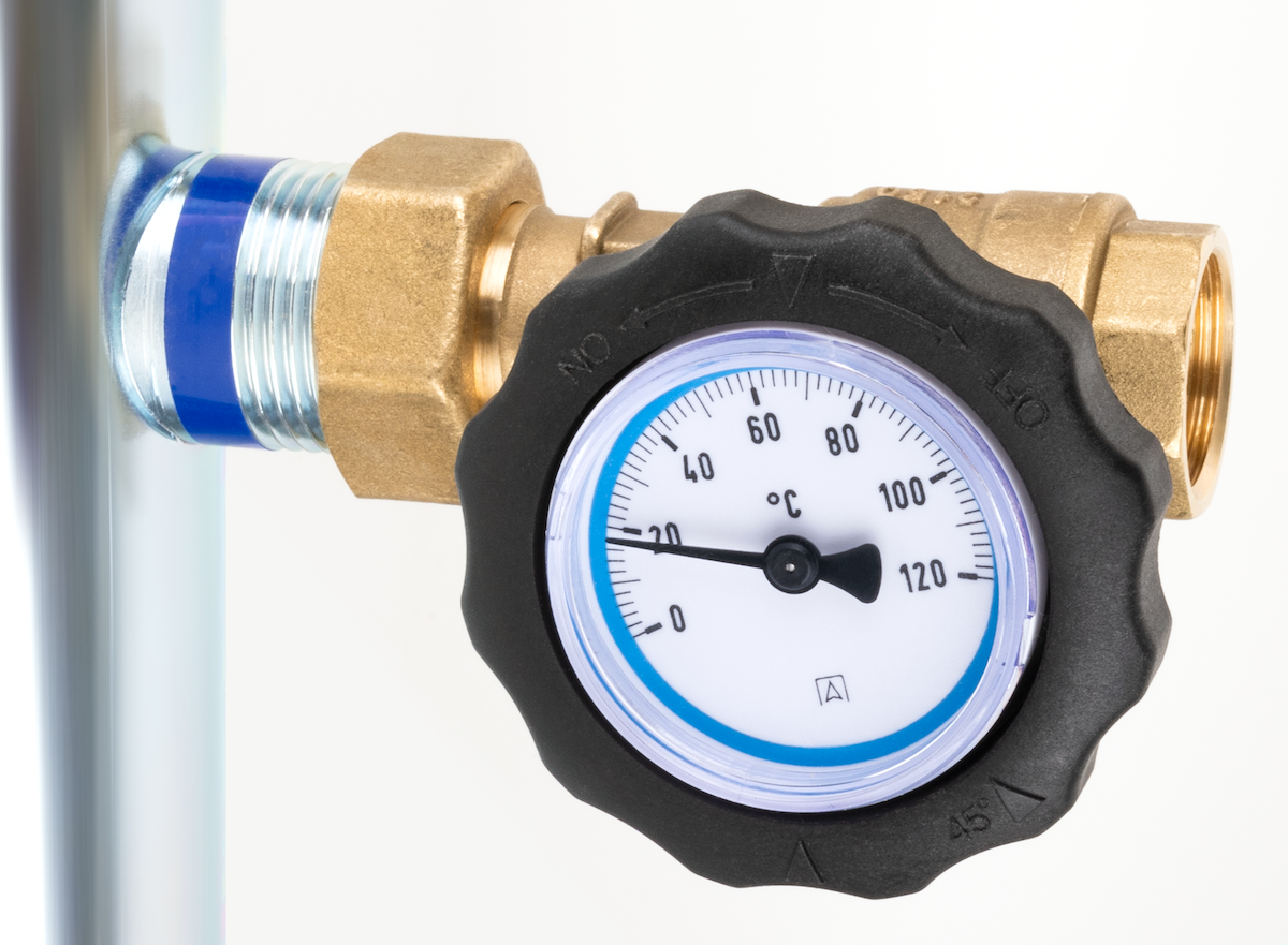 Zawór zwrotny wbudowany w zawór odcinający z niebieskim termometrem.
