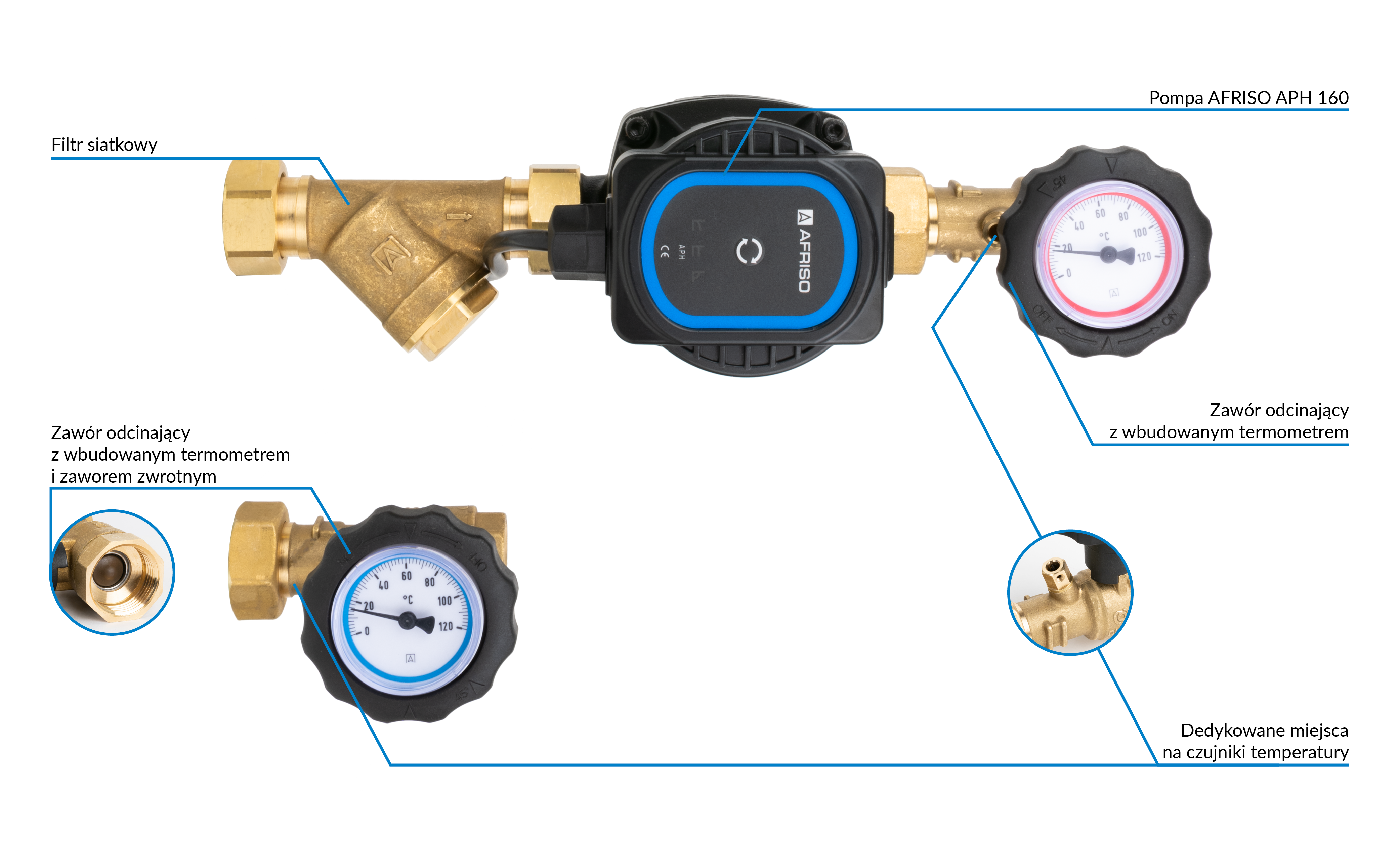 Zawory odcinające ze zintegrowanymi termometrami do kontroli temperatury medium na każdym przyłączu.