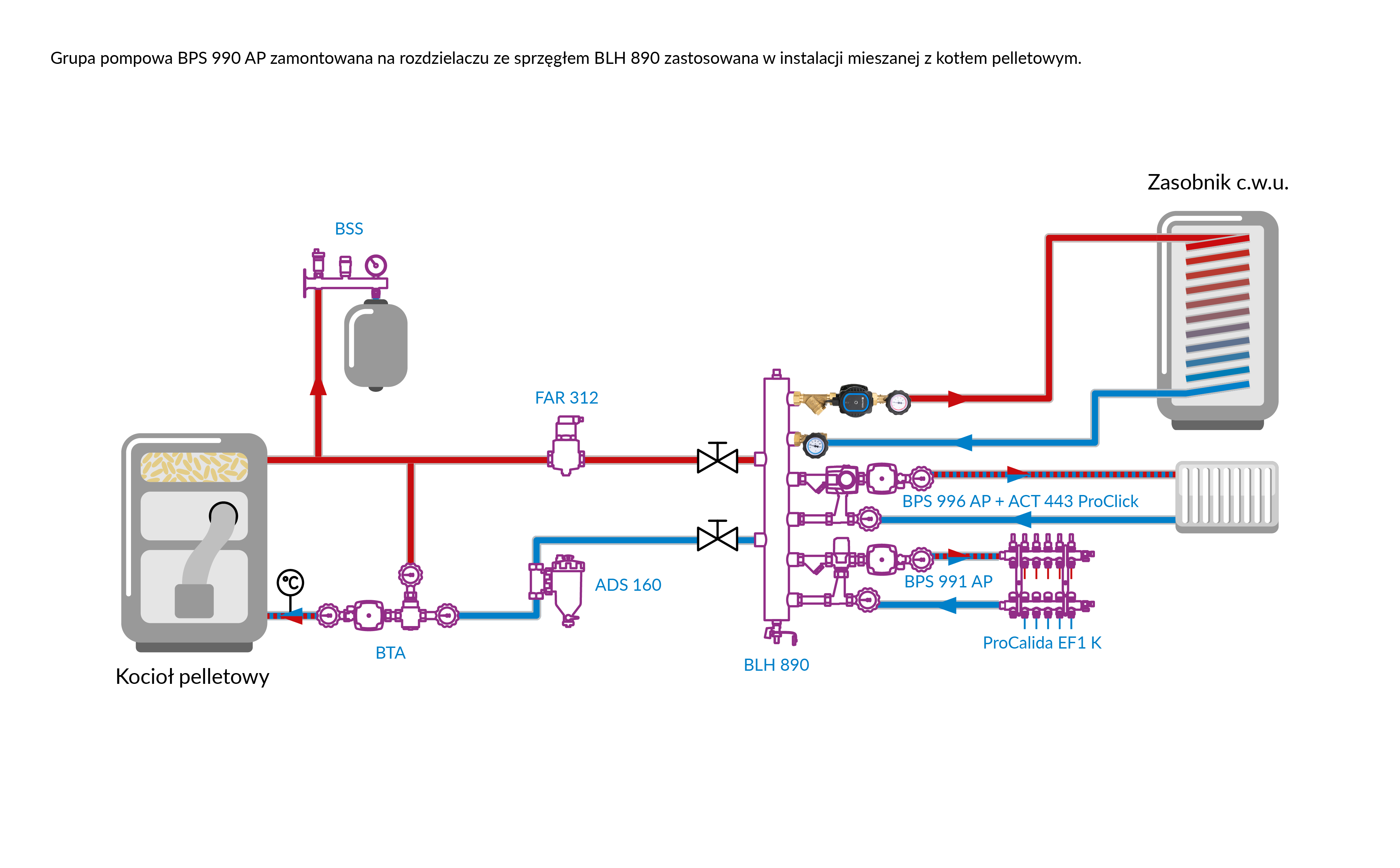 Stosowana w instalacjach grzewczych i chłodzących.Montowana na rozdzielaczu ze sprzęgłem hydraulicznym BLH 890 lub między źródłem ciepła/chłodu a odbiornikiem.