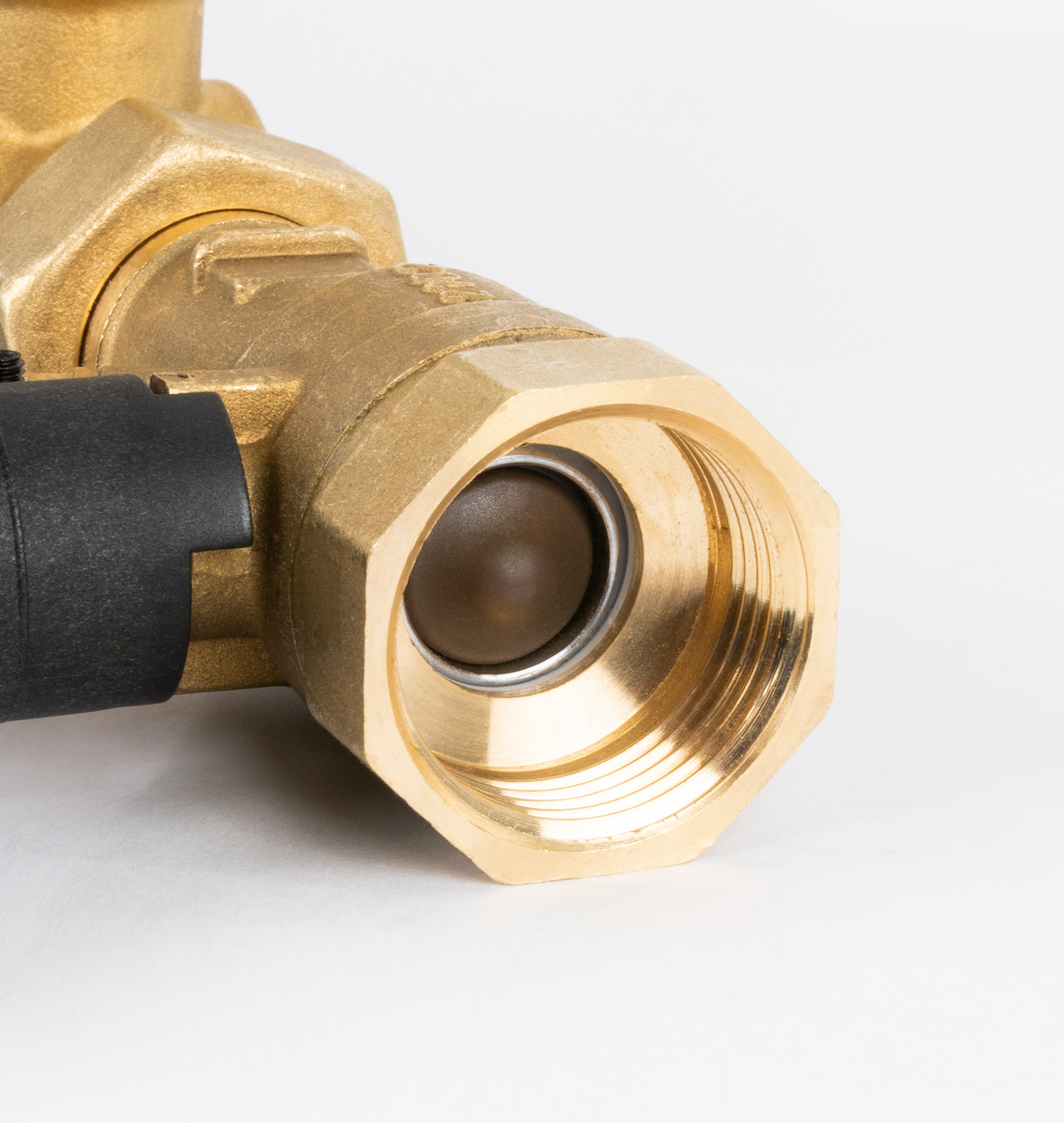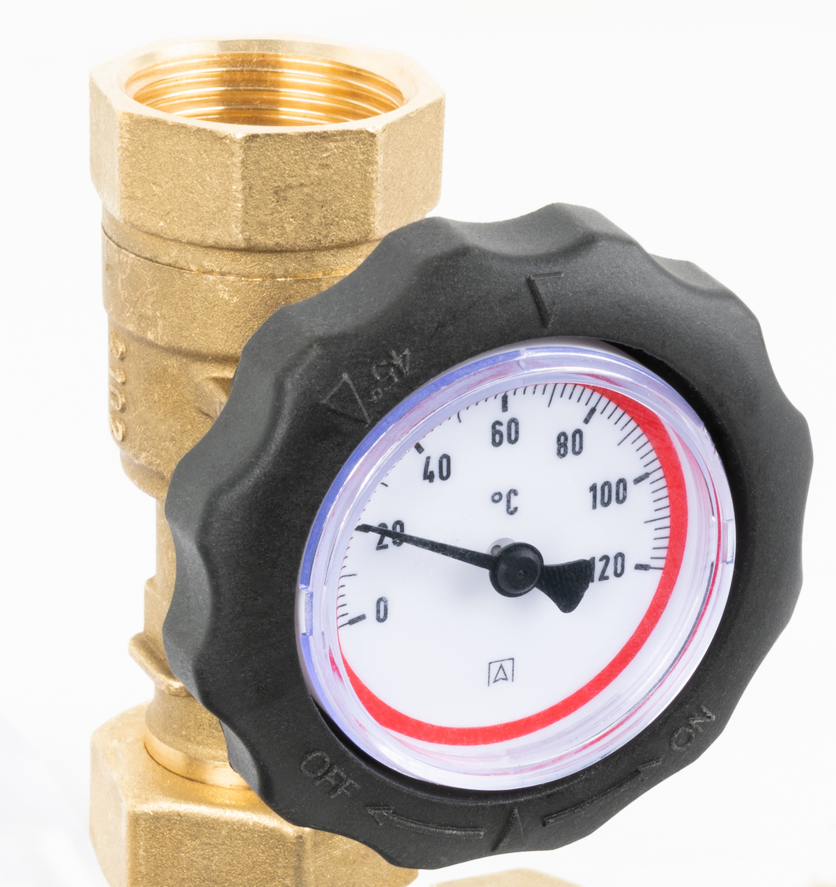 Zawory odcinające ze zintegrowanymi termometrami do kontroli temperatury medium na każdym przyłączu.