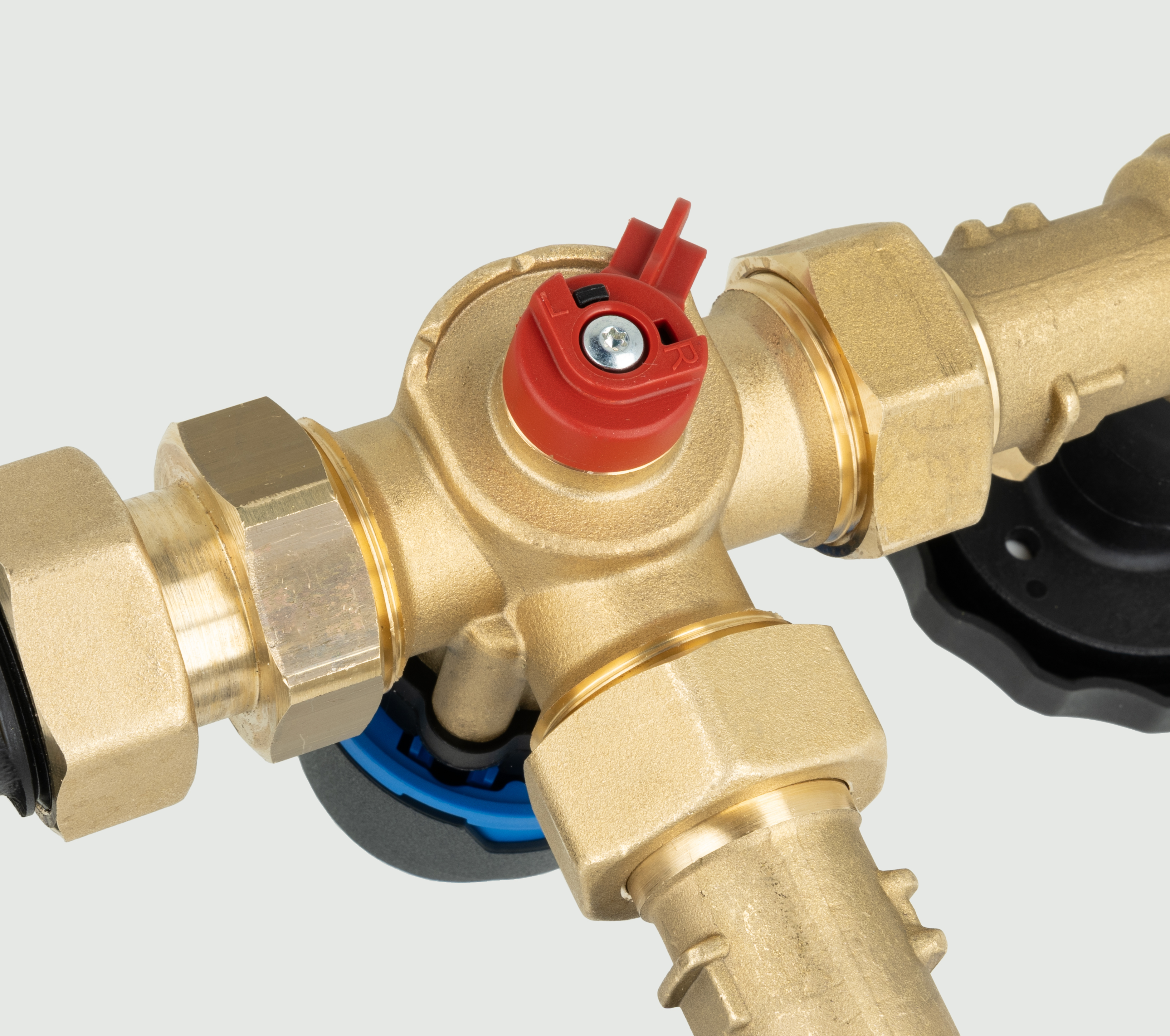 Zawór zwrotny wbudowany w zawór odcinający z niebieskim termometrem.