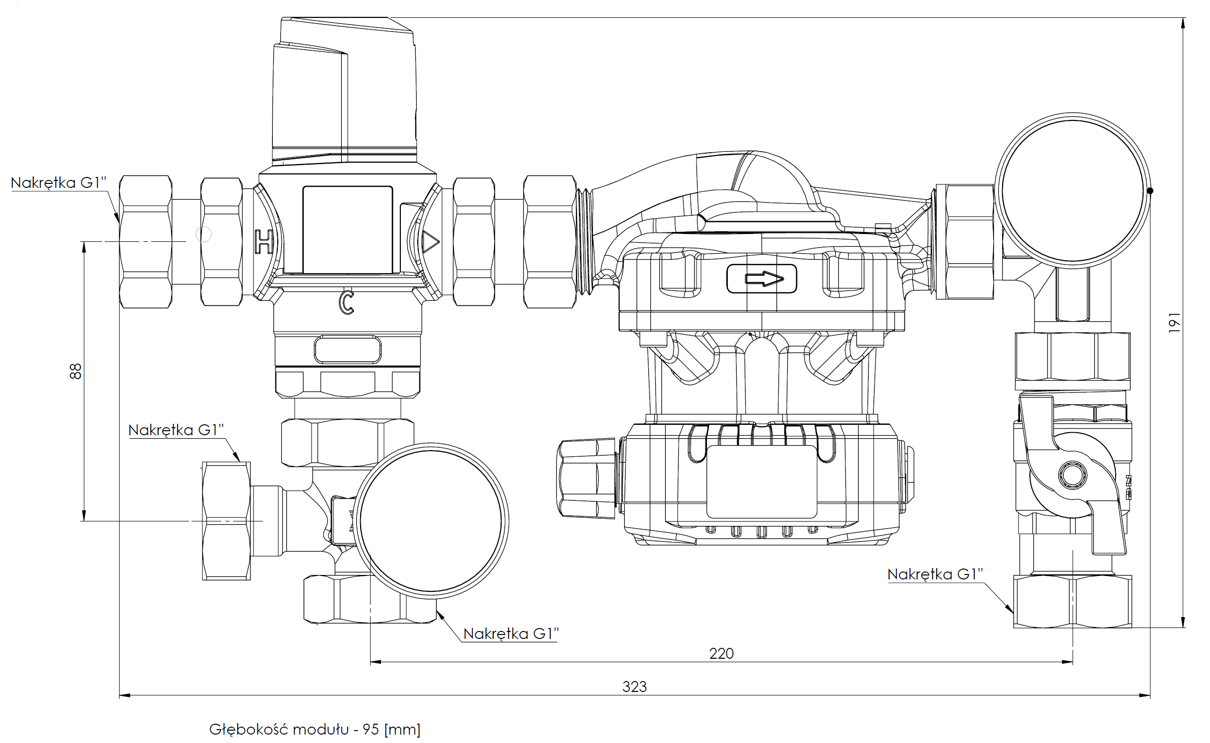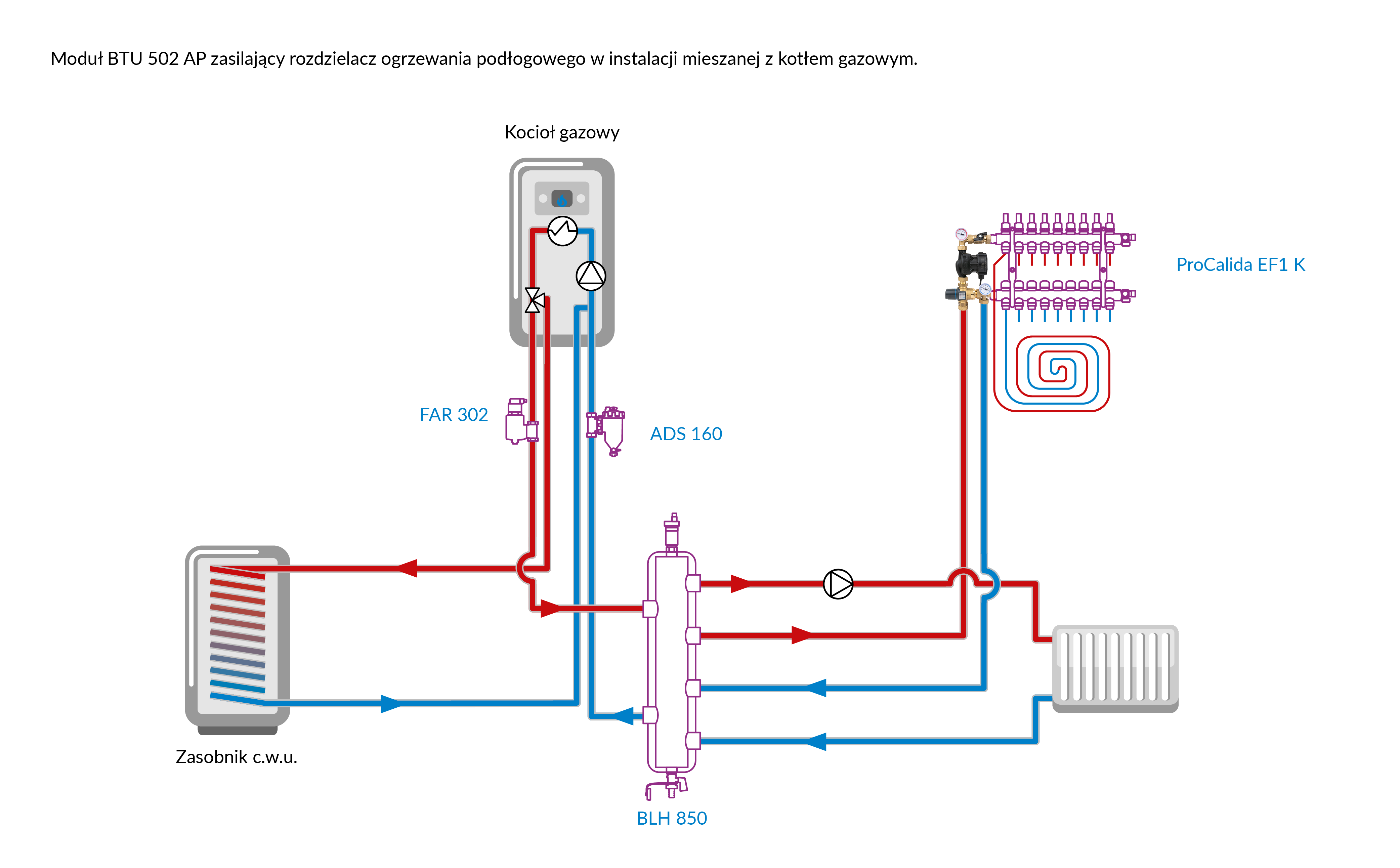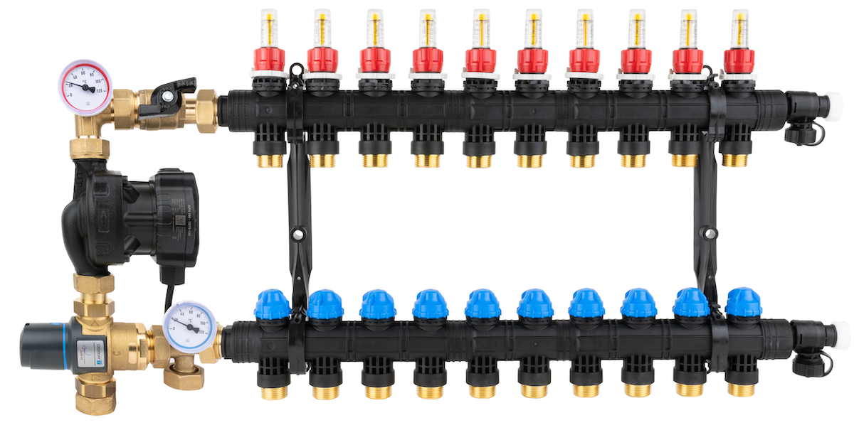 Stosowany w instalacjach grzewczych.Montowany między źródłem ciepła a rozdzielaczem ogrzewania płaszczyznowego w szafce rozdzielacza.