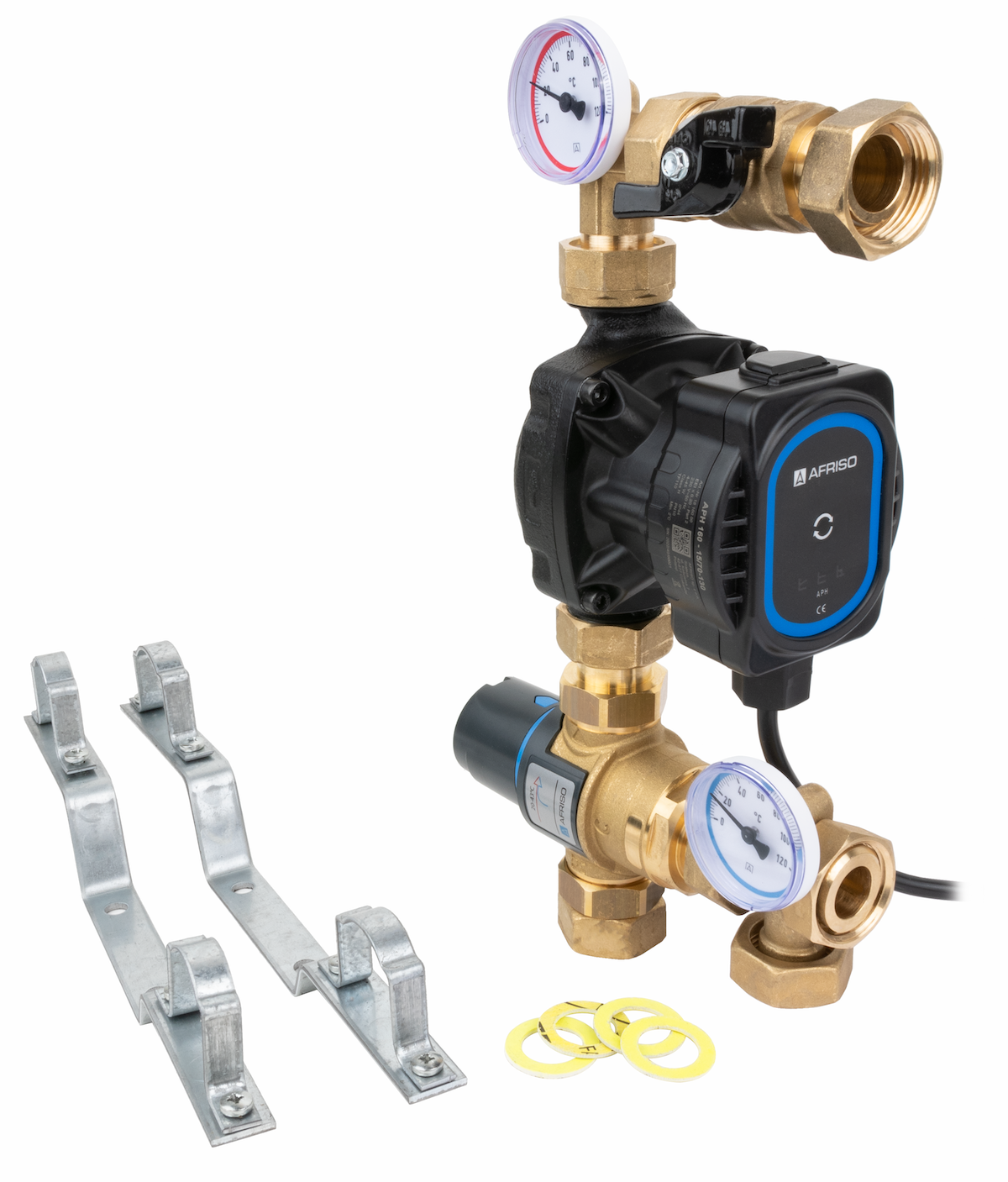 Grupa pompowa AFRISO BTU 502 AP nakrętka x nakrętka 1'' x 1'', z zaworem termostatycznym, z pompą obiegową AFRISO APH 160 15-7/130 mm
