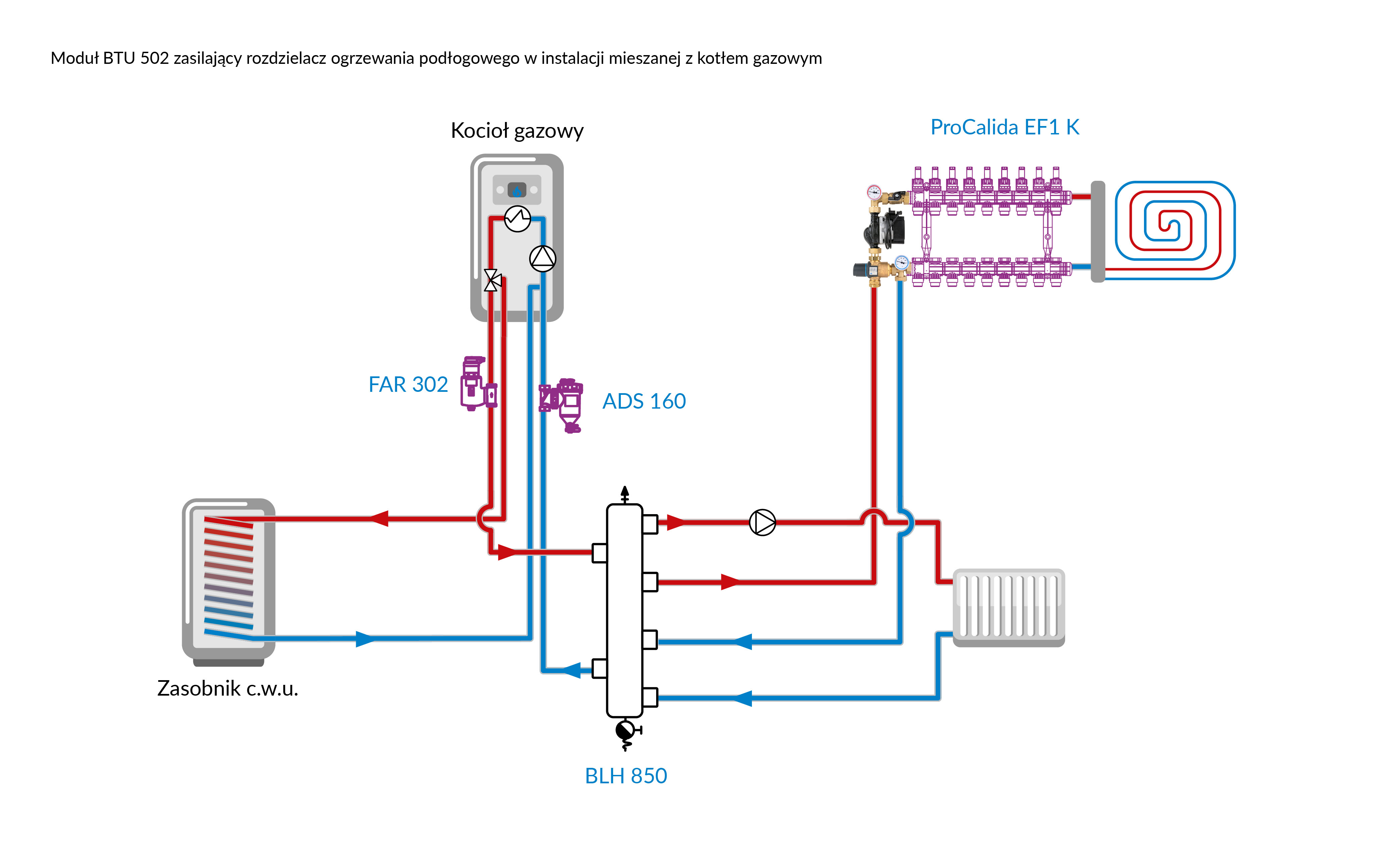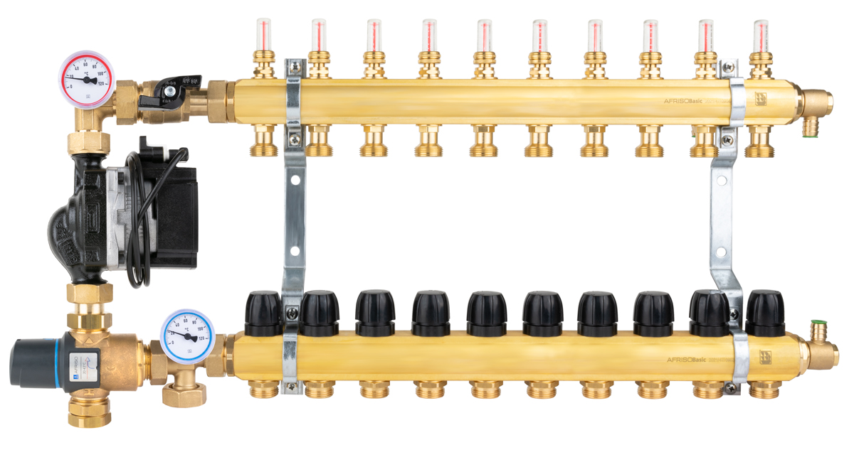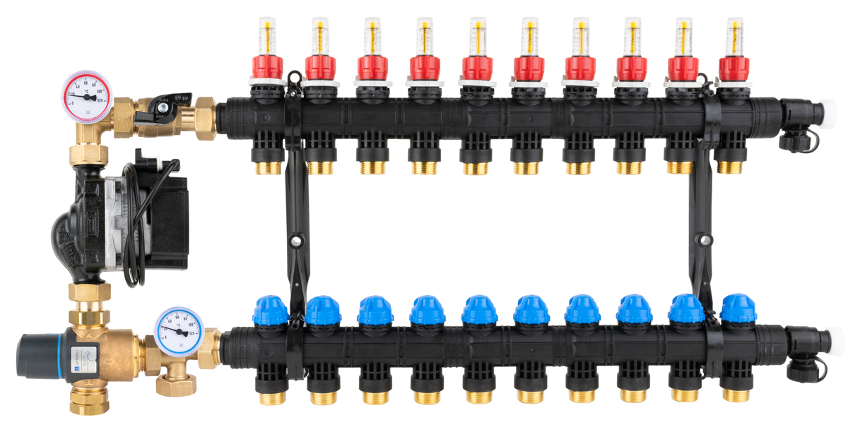Stosowany w instalacjach grzewczych.Montowany między źródłem ciepła a rozdzielaczem ogrzewania płaszczyznowego w szafce rozdzielacza.