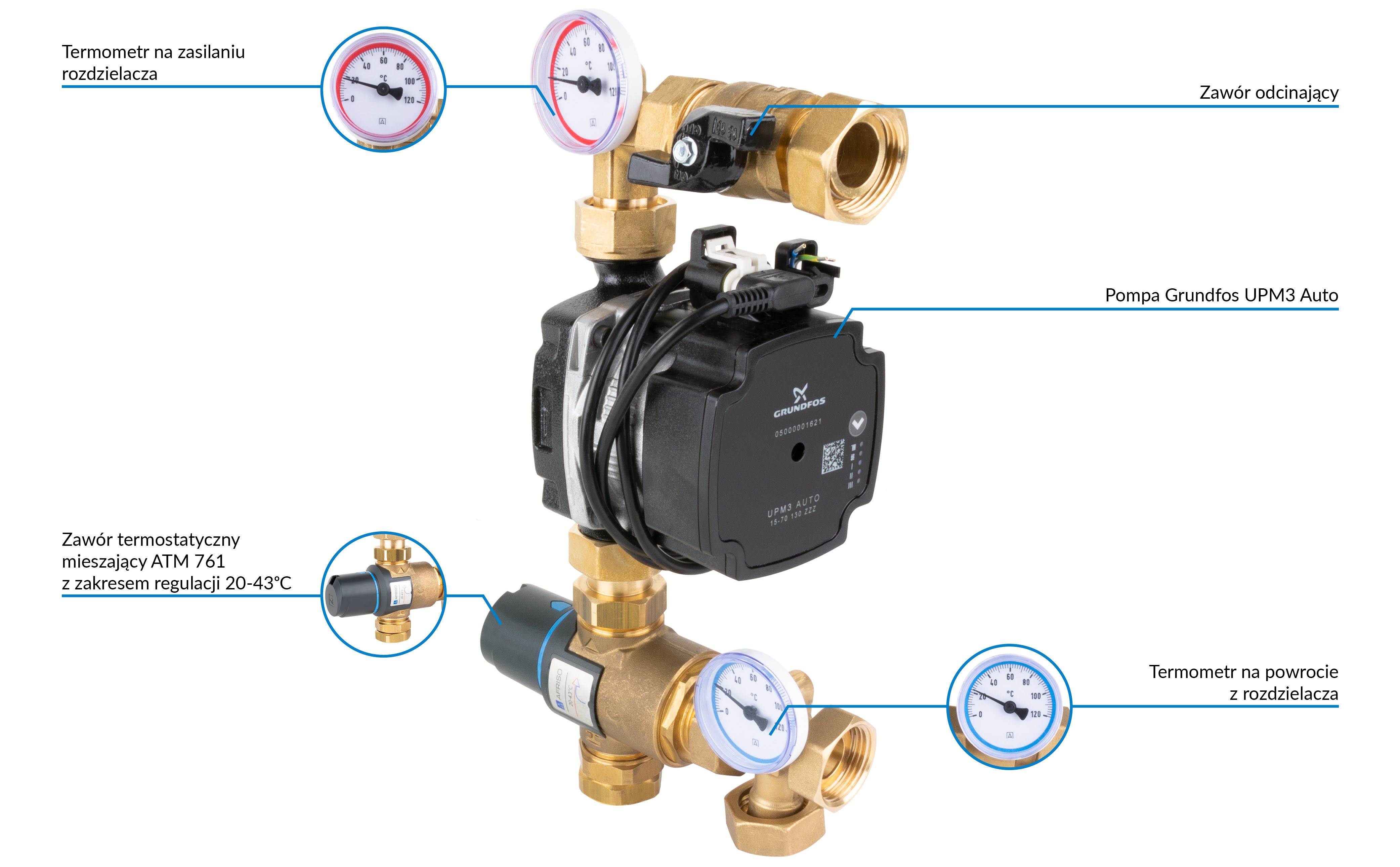 Termometry na zasilaniu i powrocie z rodzielacza kontrolują temperaturę medium.