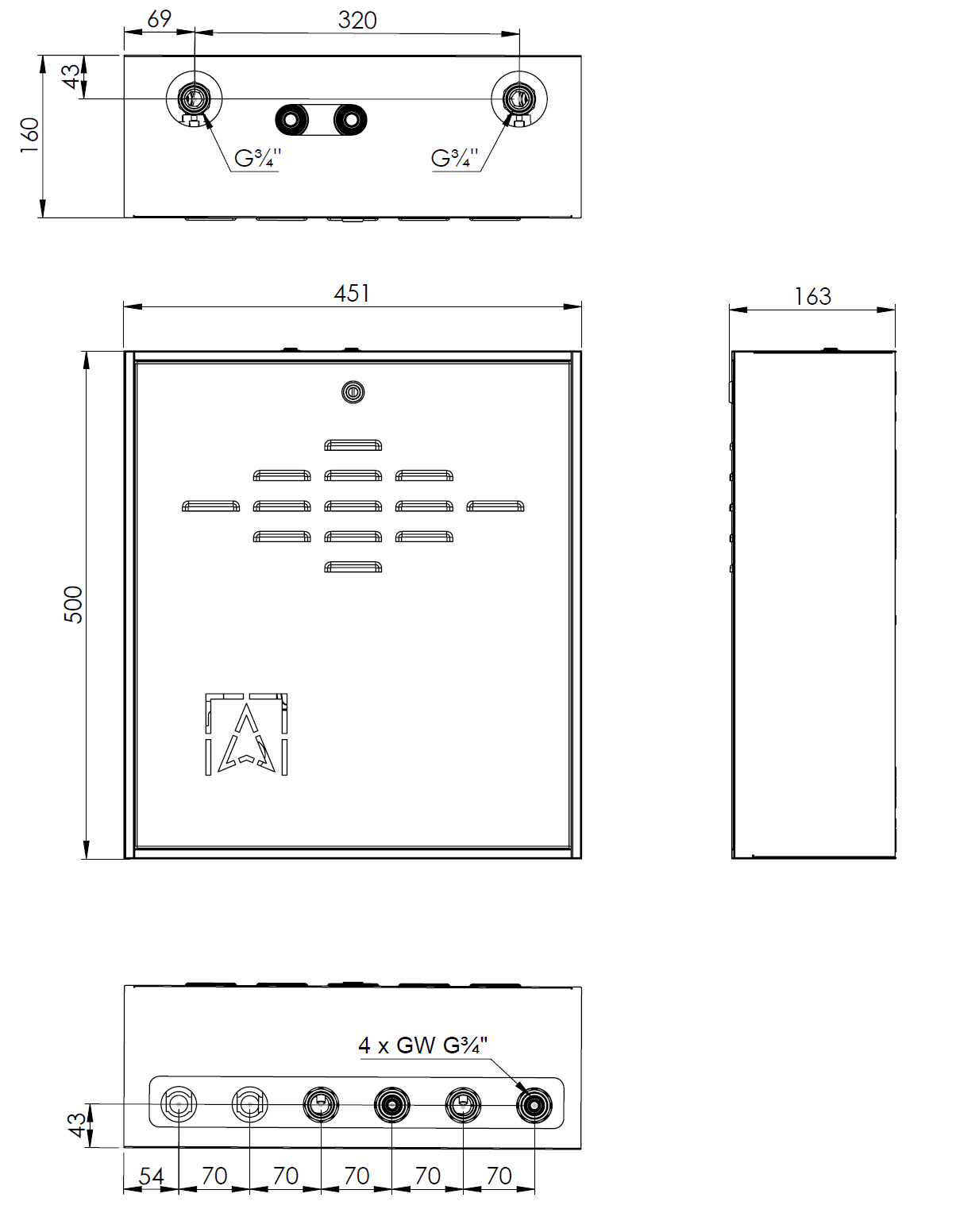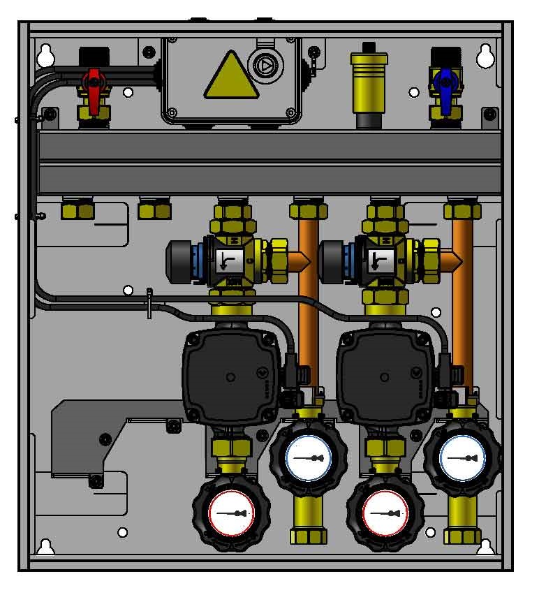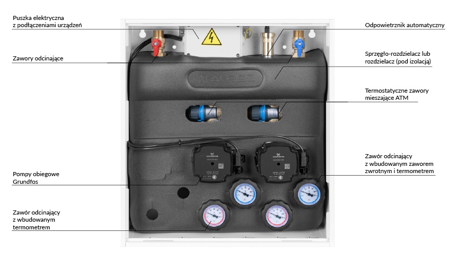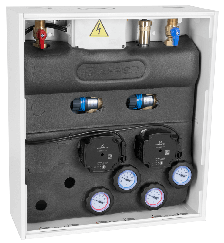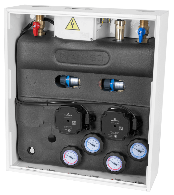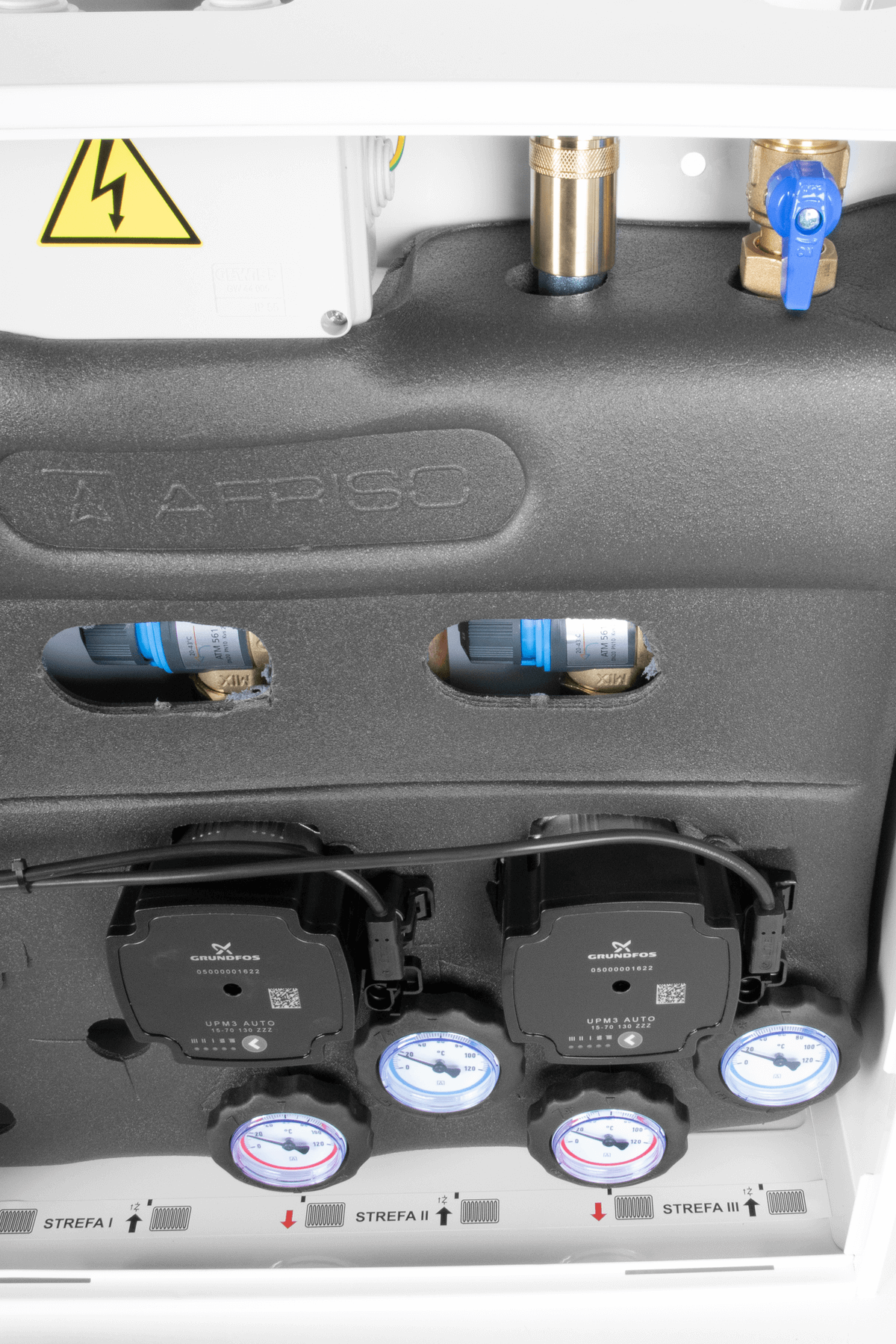 Wyposażony w pompy Grundfos UPm³ oraz 2 mieszające zawory termostatyczne ATM 561.
