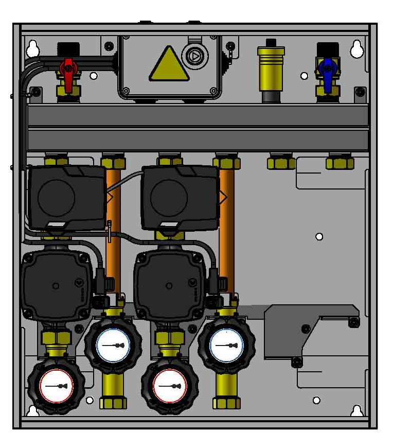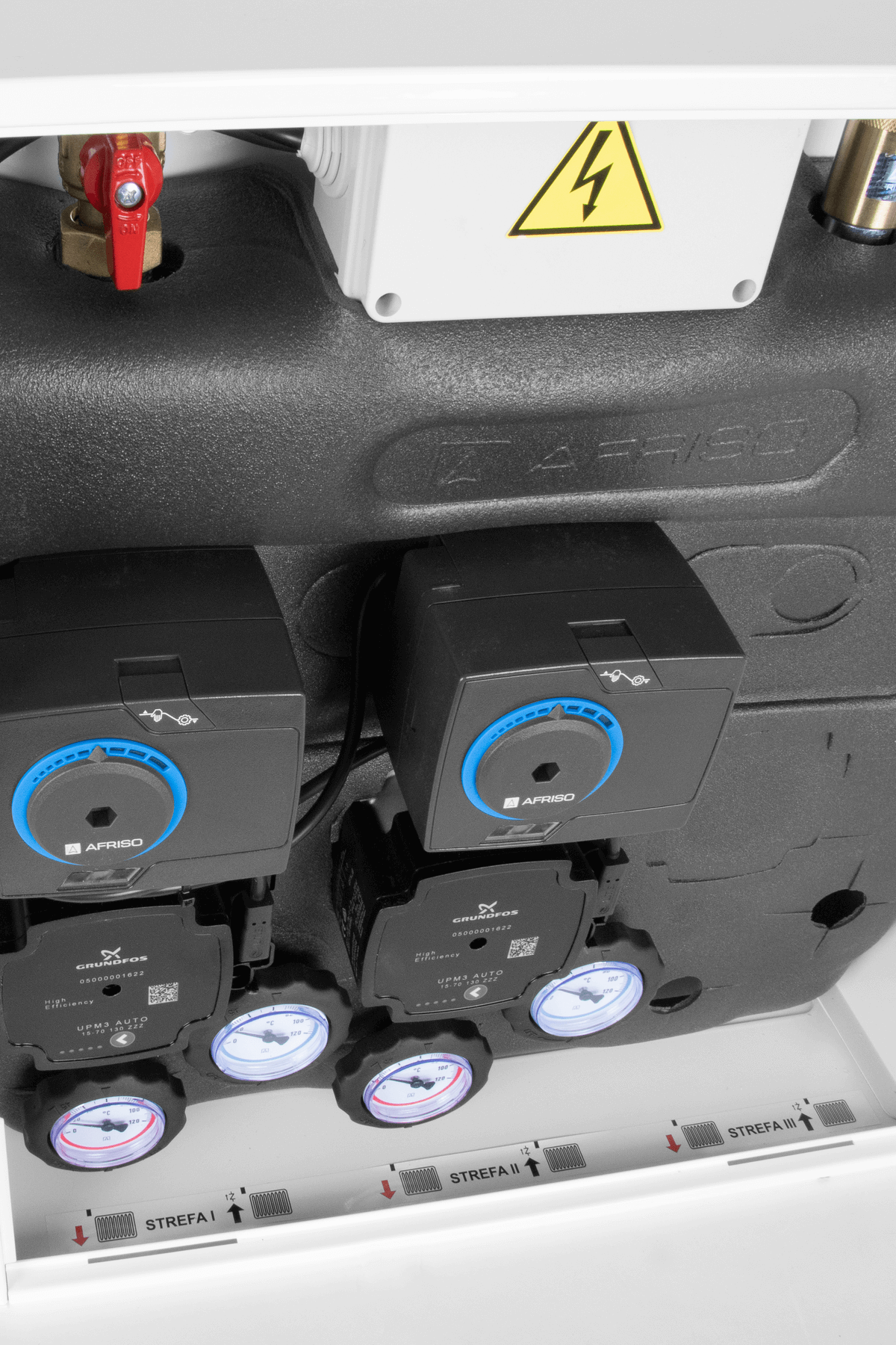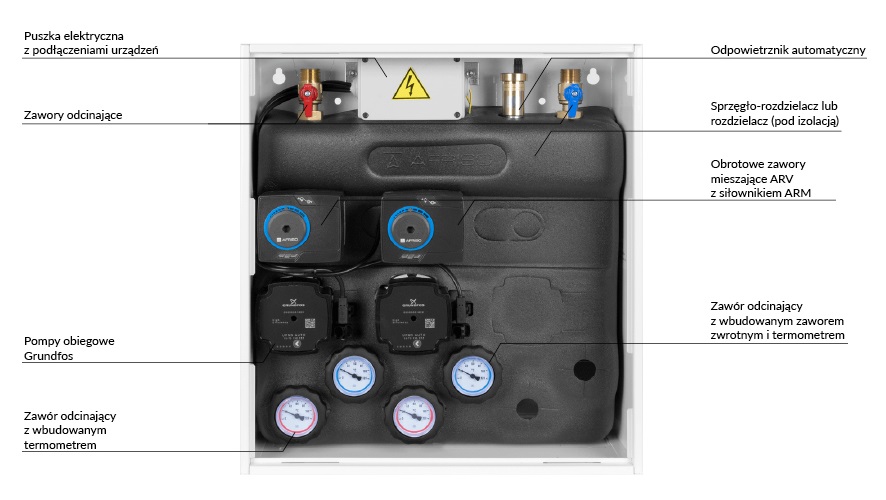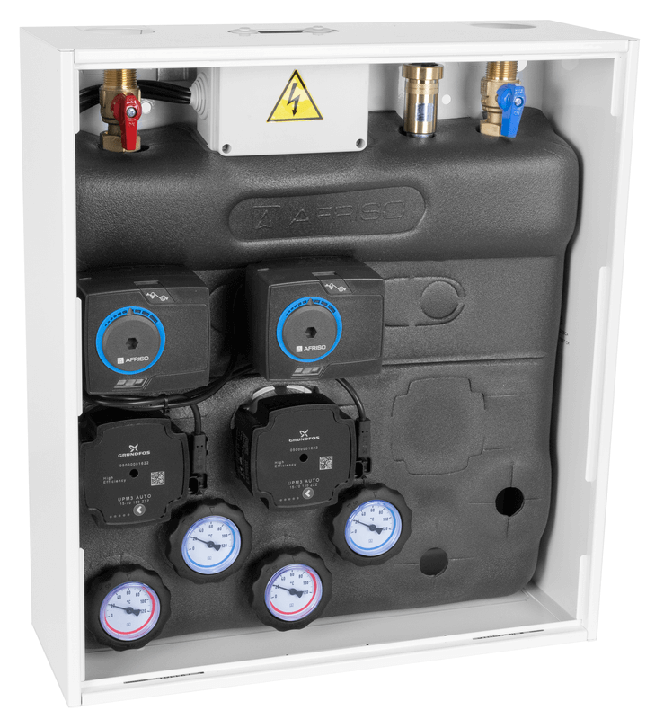 Wyposażony w pompy Grundfos UPm³ i zawory obrotowe z siłownikami elektrycznymi ARM 141.
