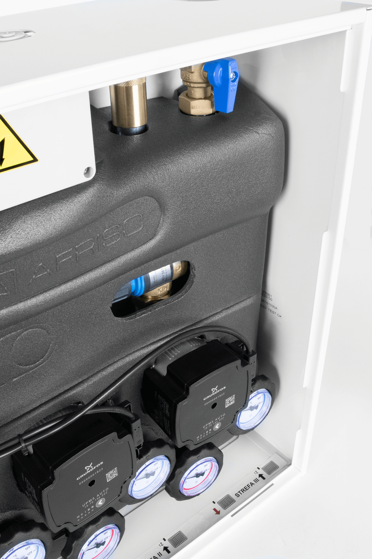 Wyposażony w pompy Grundfos UPm³ i termostatyczny zawór mieszający ATM 561 z regulacją 20 ÷ 43°C. Zakres dobrany na podstawie optymalnych temperatur zasilania instalacji ogrzewania podłogowego.