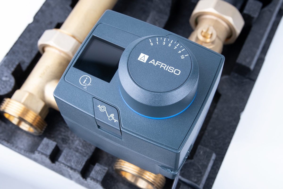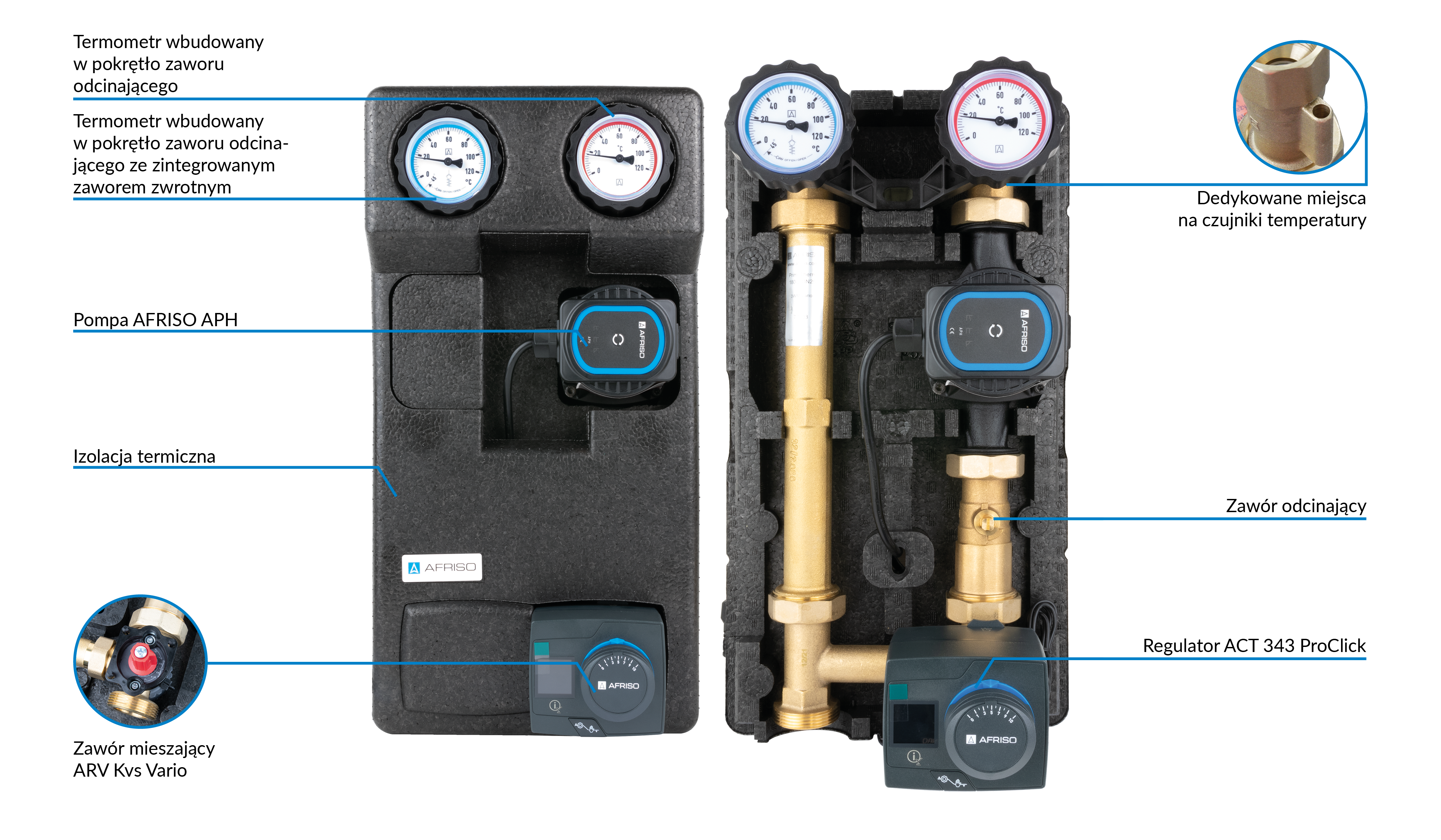 Zainstalowany zawór mieszający ARV KvsVario wartość Kvs ustawiana w zakresie 2,5÷12 m³/h, pompa AFRISO APH 25-7/180 oraz regulator ACT 343 ProClick (stałotemperaturowy, 230 V AC, 120 s).