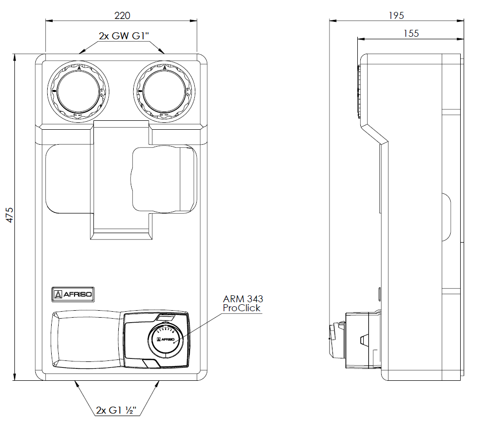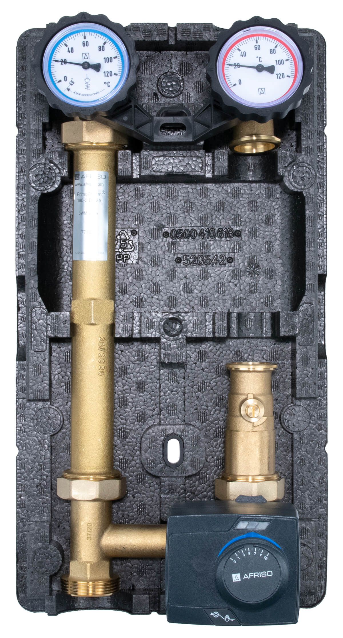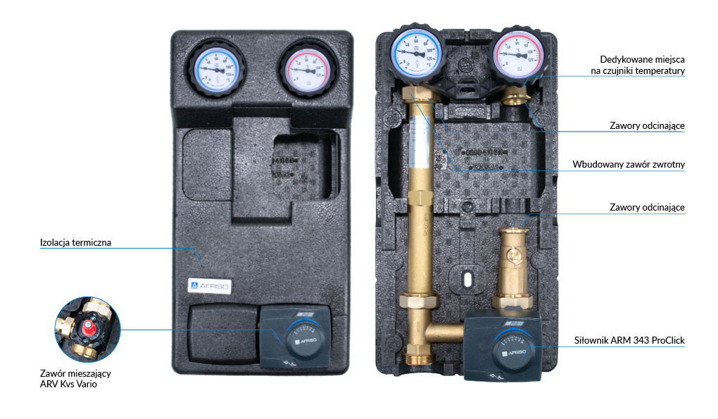 Grupa pompowa AFRISO PrimoTherm 180-2 DN 25 3-WM-SM Vario GZ x GW 1 1/2'' x 1'', z zaworem mieszającym, z izolacją, z siłownikiem arm 343 proclick