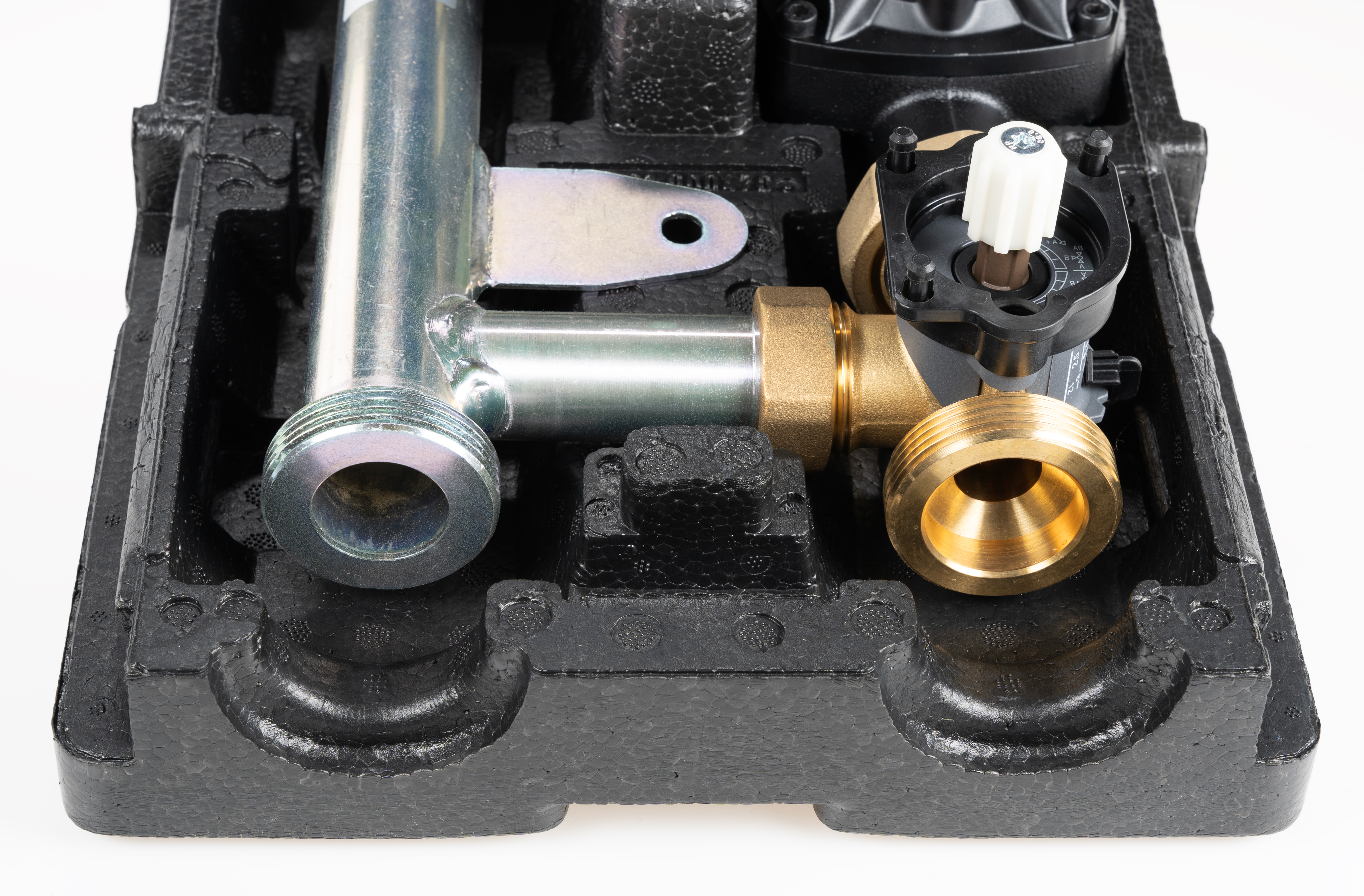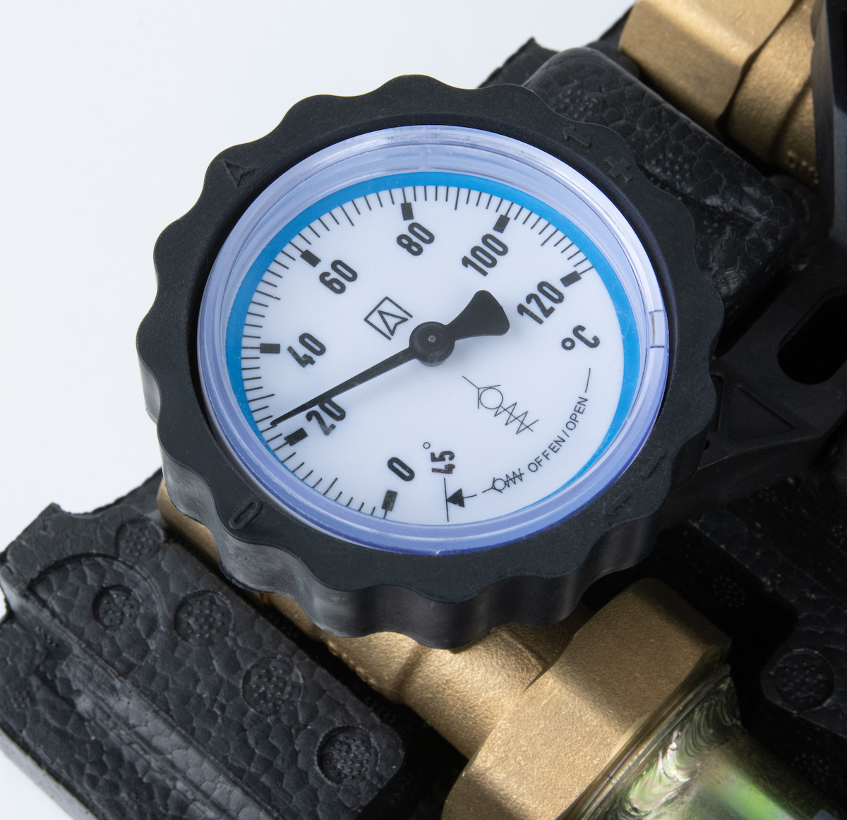 Wyposażona w niezbędne komponenty: termometry, zawór zwrotny, zawory odcinające na zasilaniu i powrocie i izolację termiczną.