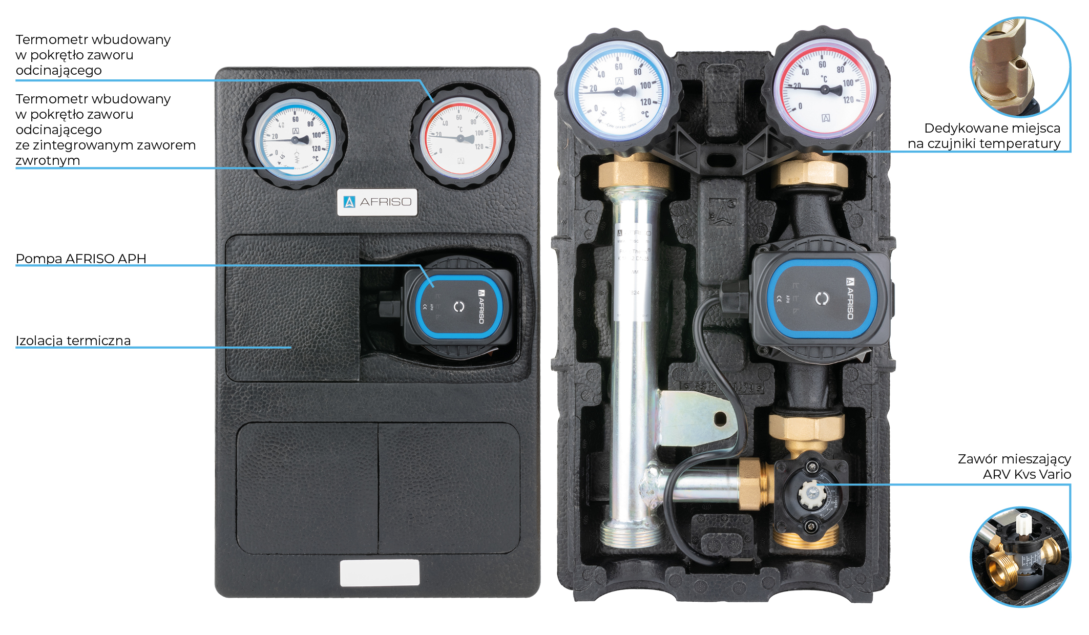 Zainstalowany zawór mieszający ARV Kvs Vario z możliwością ustawienia Kvs w zakresie 2,5÷12 m³/h oraz pompa AFRISO APH 25-7/180.