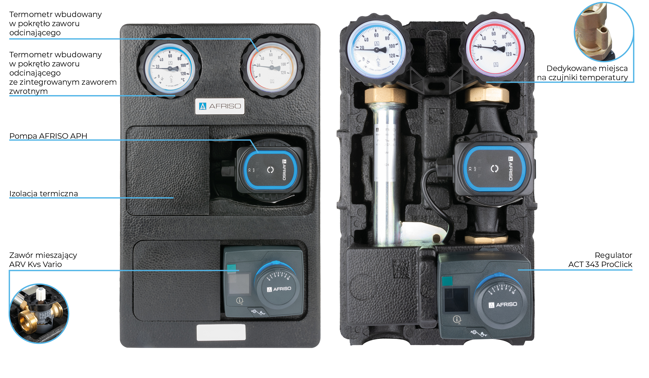 Zainstalowany zawór mieszający ARV Kvs Vario z możliwością ustawienia Kvs w zakresie 2,5÷12 m³/h, pompa AFRISO APH 25-7/180 oraz regulator ACT 343 ProClick (stałotemperaturowy, 230 V AC, 120 s).
