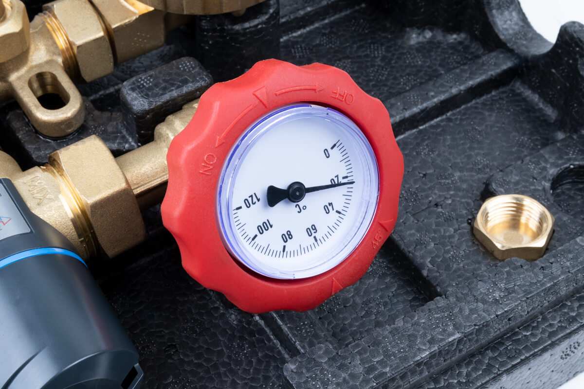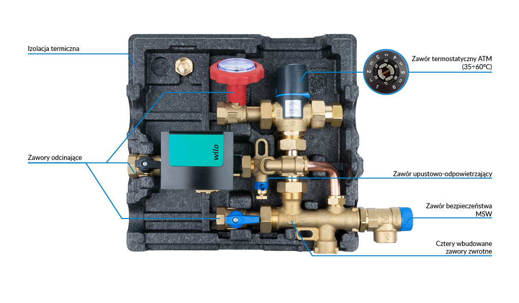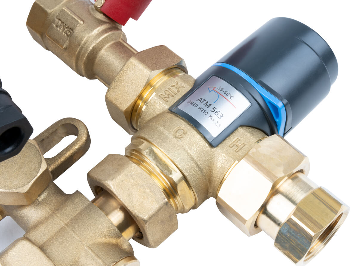 - Zawór termostatyczny ATM zapobiega oparzeniom i pozwala bezpiecznie podnieść temperaturę w zasobniku (np. celem wygrzania lub zwiększenia ilości ciepłej wody).