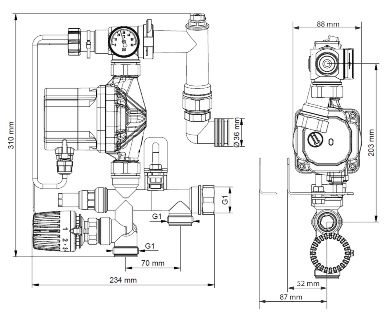 Termometr na zasilaniu rozdzielacza umożliwia kontrolę temperatury medium i tym samym poprawność działania grupy pompowej..