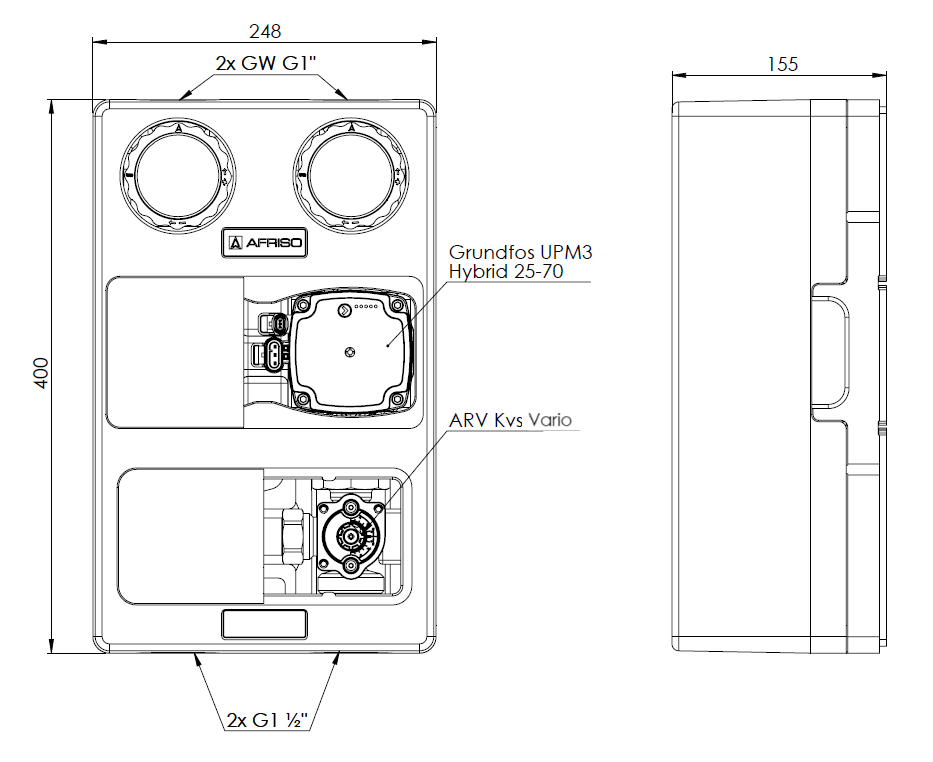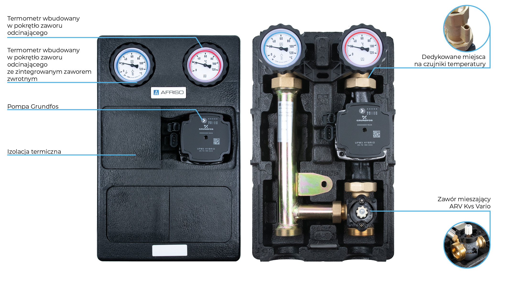 - Zainstalowany zawór mieszający ARV Kvs Vario z możliwością ustawienia Kvs w zakresie 2,5÷12 m³/h oraz pompa obiegowa Grundfos UPM3 Hybrid.