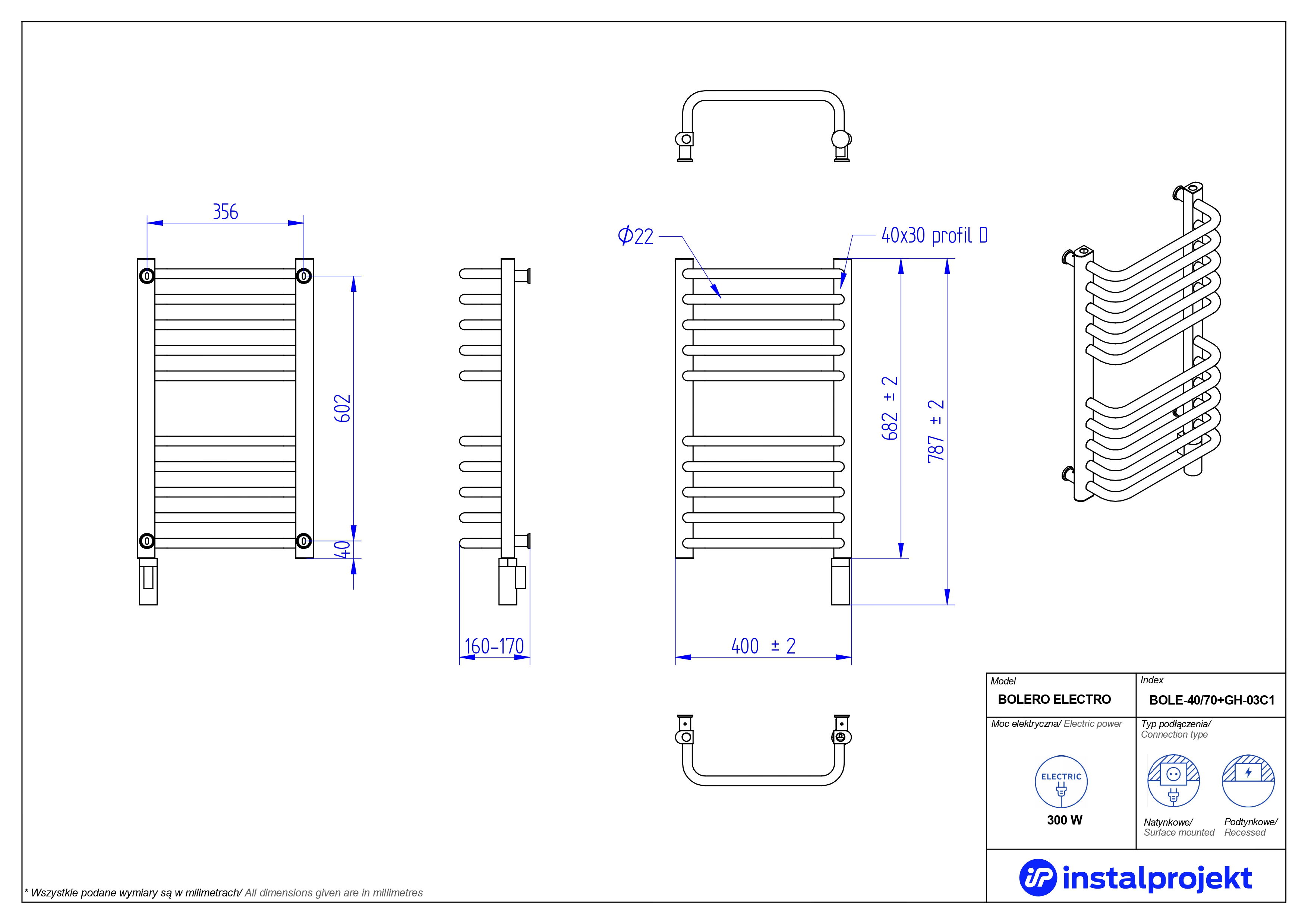 Grzejnik elektryczny (suszarka) INSTAL-PROJEKT BOLERO ELECTRO, wym. 682 (787 z grzałką)/400 mm, kolor biały połysk, moc 300 W