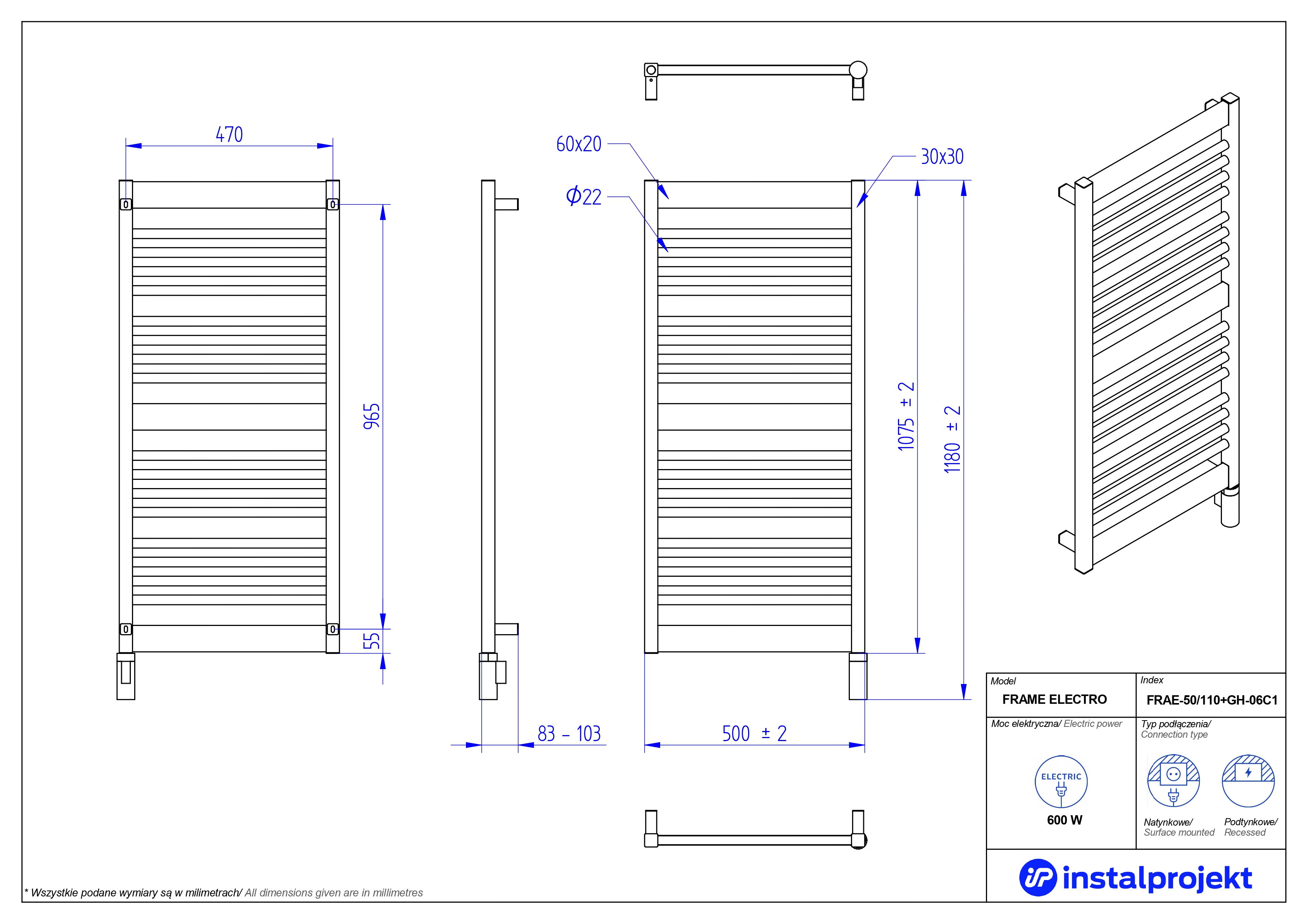 Grzejnik elektryczny (suszarka) INSTAL-PROJEKT FRAME ELECTRO, wym. 1075 (1180 z grzałką)/500 mm, kolor biały mat, moc 600 W