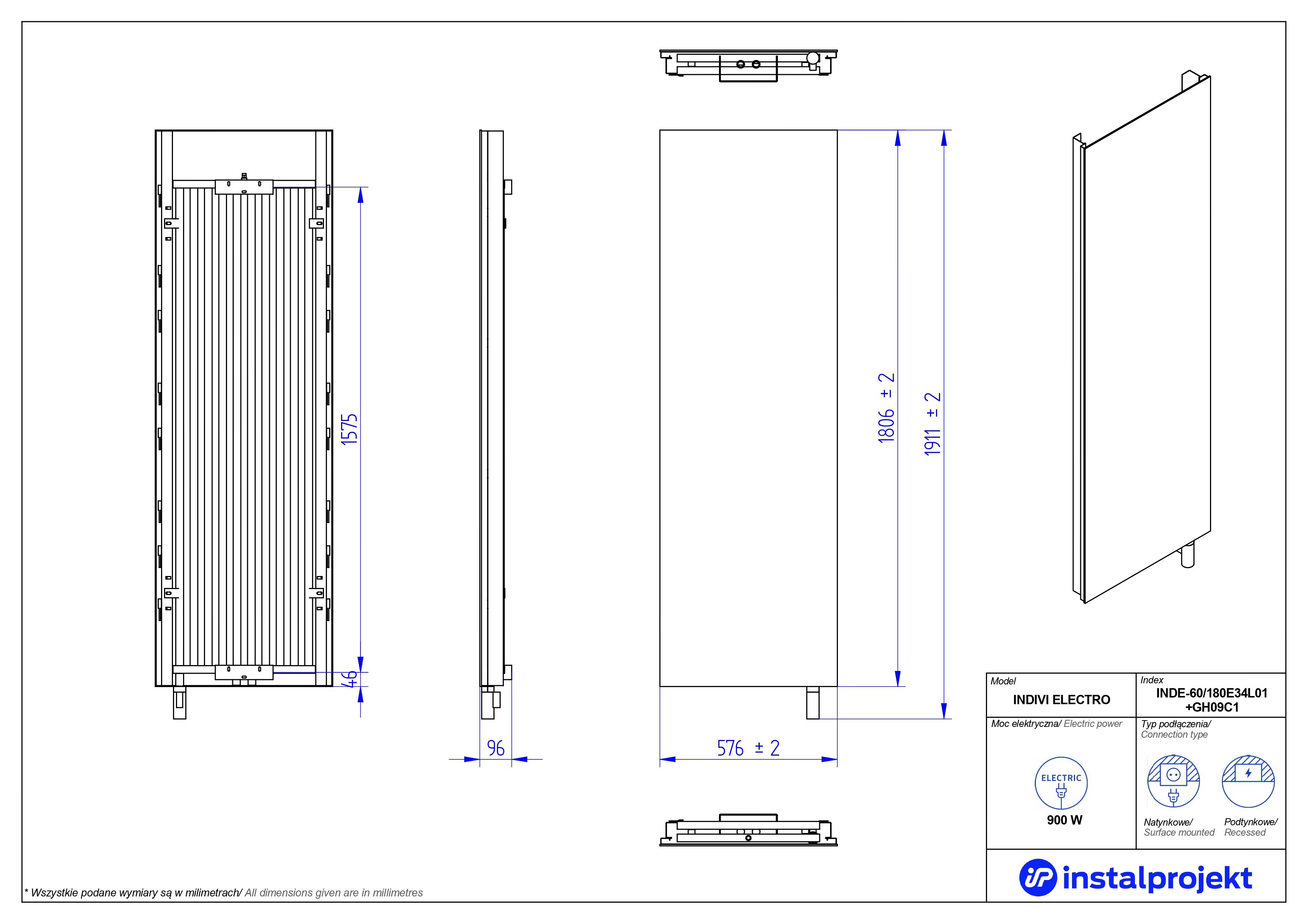 Grzejnik elektryczny (suszarka) INSTAL-PROJEKT INDIVI ELECTRO, wym. 1806 (1911 z grzałką)/576 mm, moc 900 W