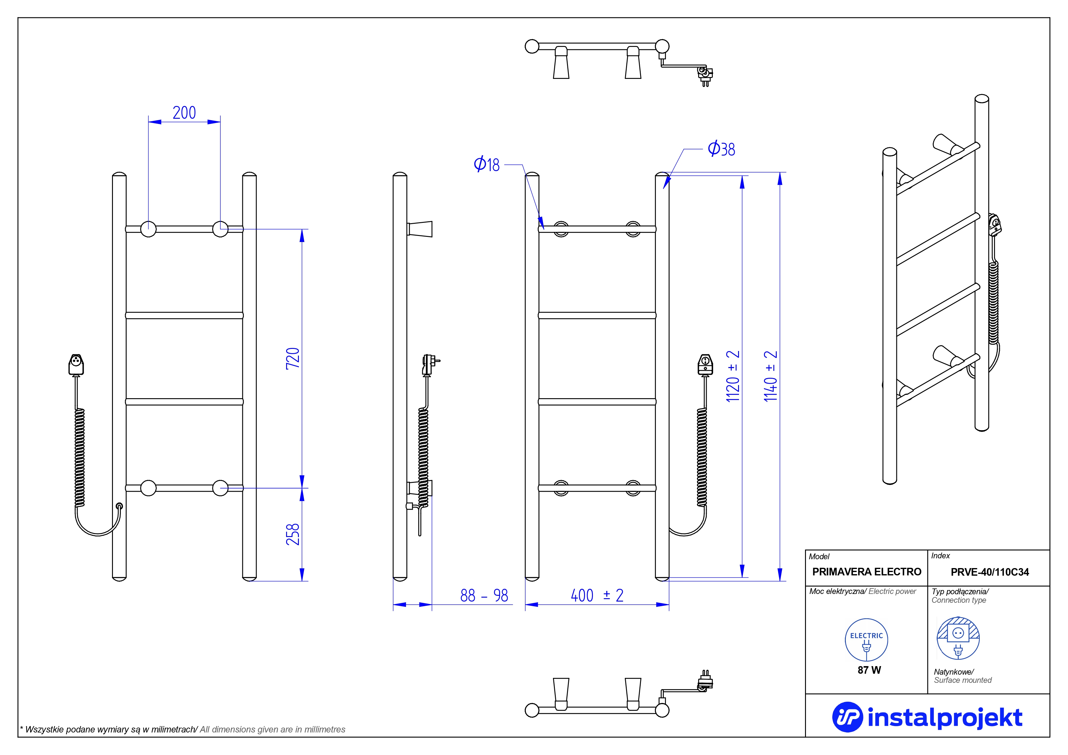 Grzejnik elektryczny (suszarka) INSTAL-PROJEKT PRIMAVERA ELECTRO, wym. 1120/400 mm, kolor biały mat, moc 87 W