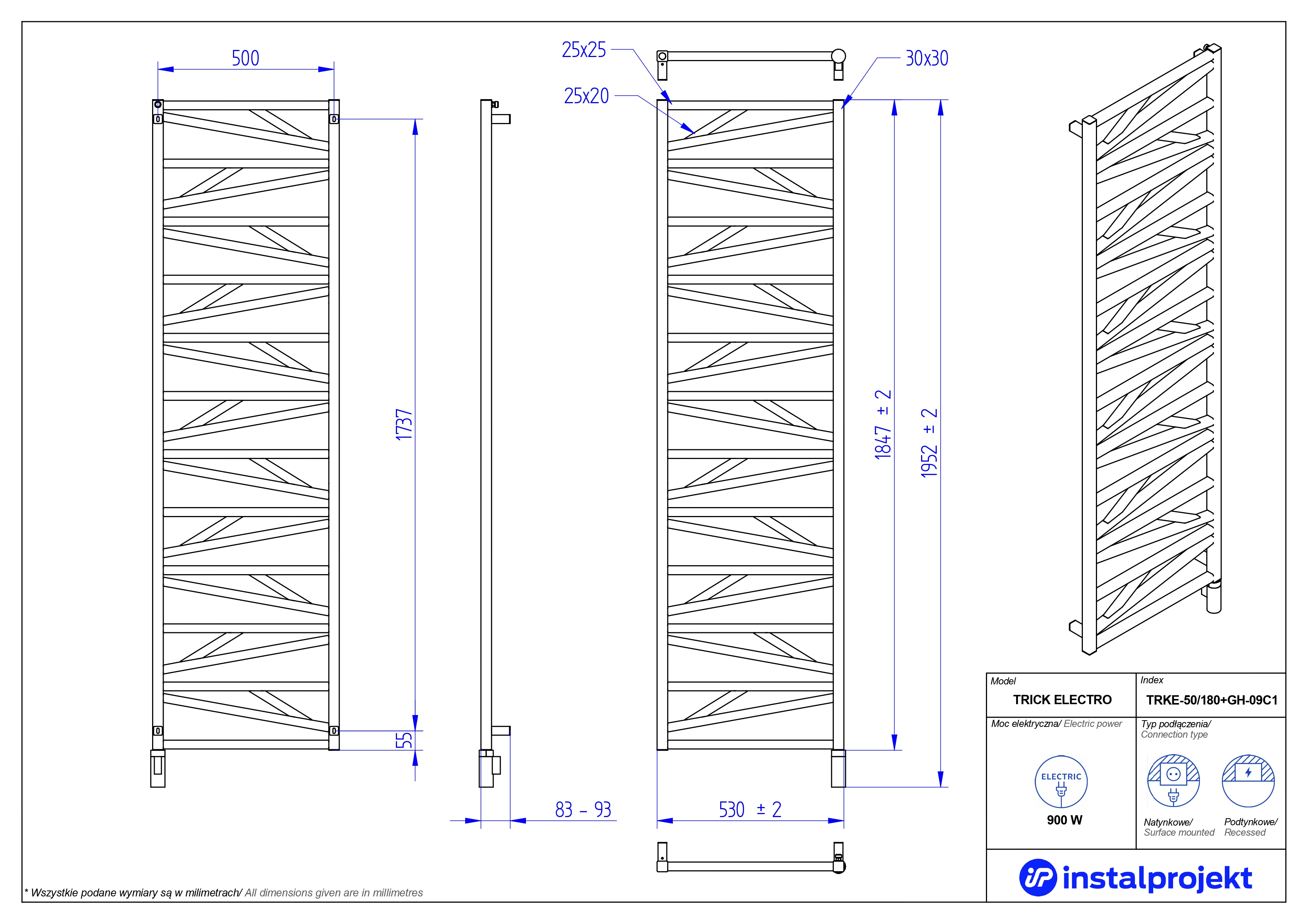 Grzejnik elektryczny (suszarka) INSTAL-PROJEKT TRICK ELECTRO, wym. 1847 (1952 z grzałką)/530 mm, kolor czarny mat, moc 900 W