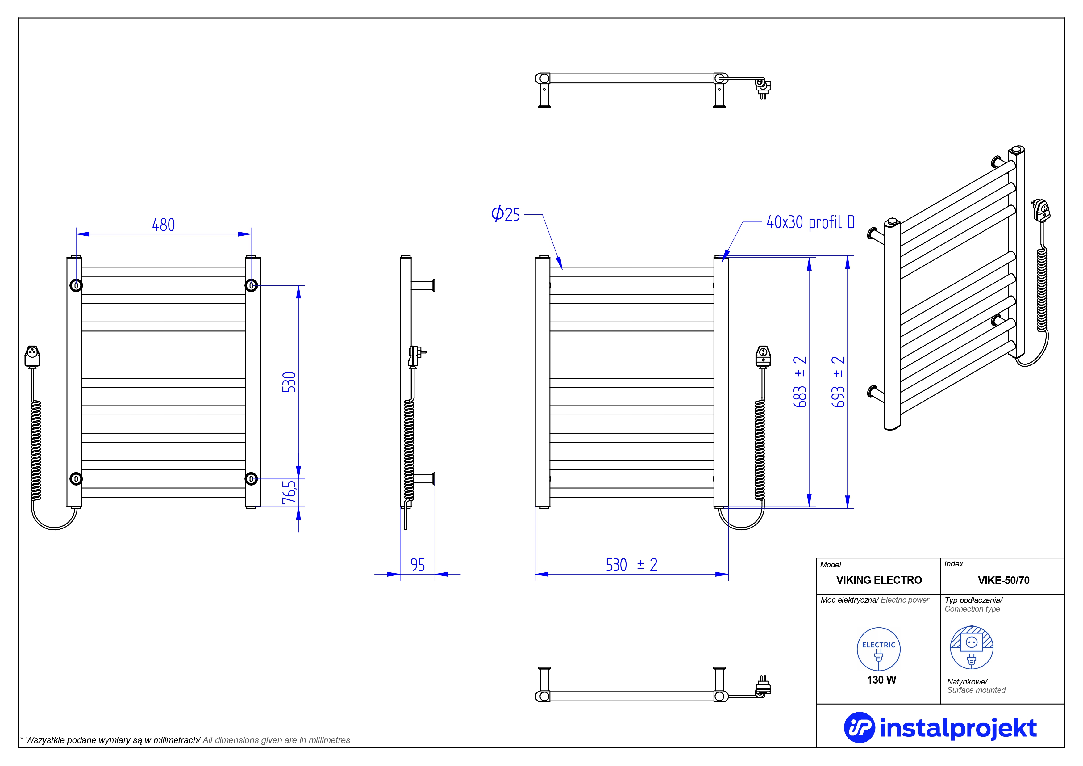 Grzejnik elektryczny (suszarka) INSTAL-PROJEKT VIKING ELECTRO, wym. 693/530 mm, kolor czarny mat, moc 130 W