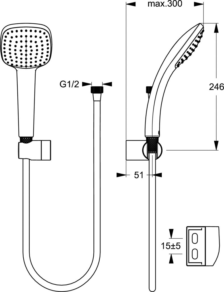 Zestaw natryskowy M1, jednofunkcyjny, 100 mm. Słuchawka prysznicowa średnicy 100 mm. Gumowe końcówki dysz zapobiegające osadzaniu się kamienia. Ogranicznik przepływu wody do 8 l/min. Wąż natryskowy Idealflex, 1750 mm. Ruchomy uchwyt ścienny z tworzywa. Logo Ideal Standard.