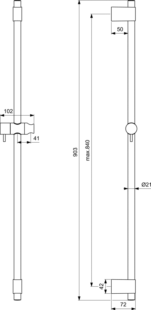 Drążek metalowy o średnicy 21 mm i długości 900 mm. Wykonane z metalu mocowanie przesuwne słuchawki. Metalowe mocowanie do ściany.