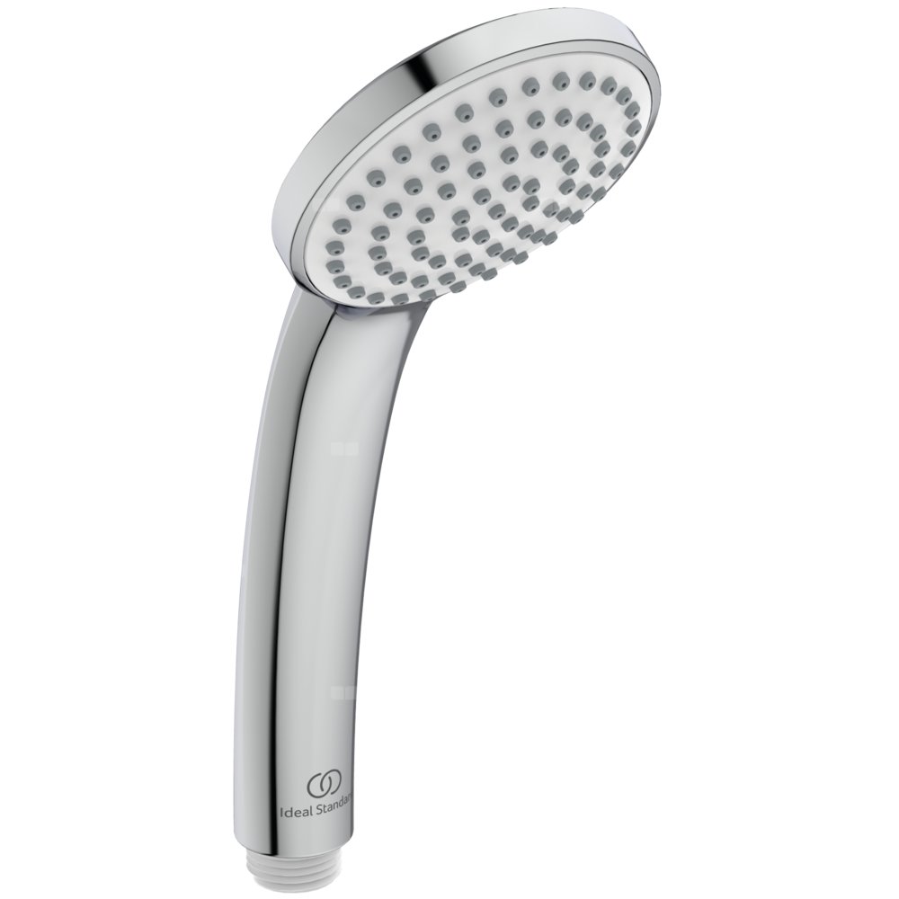 Słuchawka prysznicowa jednofunkcyjna. Gumowe końcówki dysz zapobiegające osadzaniu się kamienia. Ogranicznik przepływu wody do 8 l/min. Logo Ideal Standard, ręczna dźwignia prysznicowa.